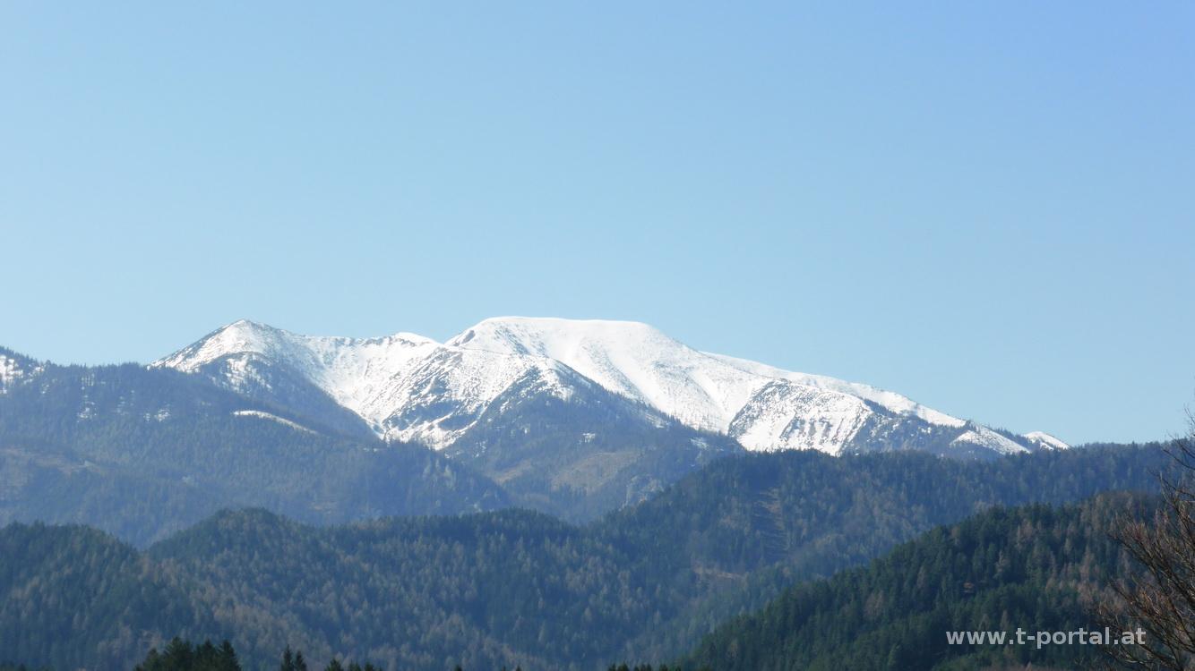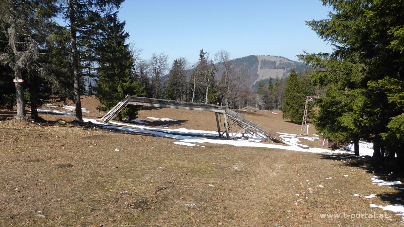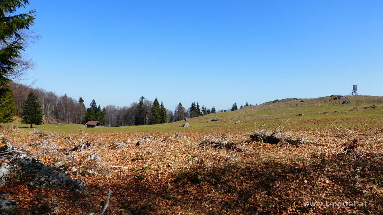 Hier wende ich nach links, es geht kurz etwas steiler hinauf, dann weiter durch Wald und Alm, über etwas Schnee bis ich kurz vor der Grabenalm zur Paulmauer abbiege. Am Zaun entlang steiler bergauf bis zur Paulmauer. Von hier hat man einen schönen Ausblick zwischen Göller und Ötscher bis ins Gesäuse. Von der Paulmauer hinunter und dann wieder hinauf zum Linsberg. Von hier ist auch bereits der Türnitzer Höger in Sichtweite. Vorbei an den Resten eines Schilifts und Blick hinunter zur Gschwendhütte. Es geht wieder hinauf zum Stadlberg und dann nochmal weiter hinunter auf ca. 1050m.
