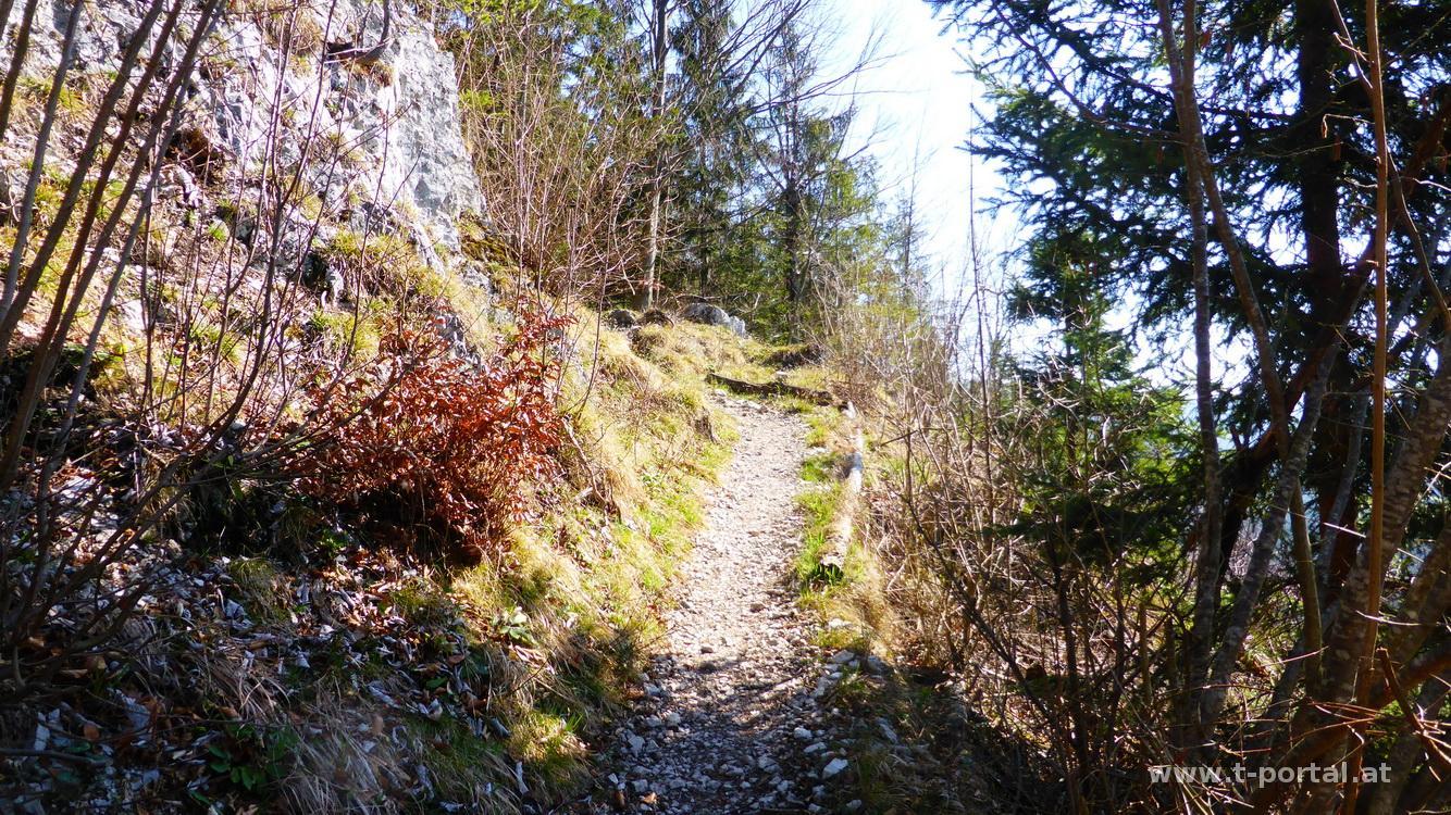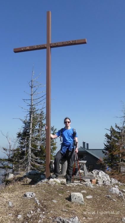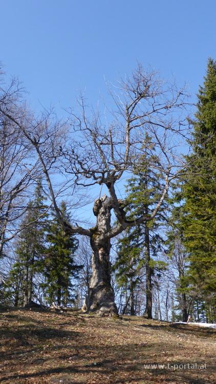 Es folgt der letzte Anstieg des Tages auf den Gipfel des Türnitzer Högers. Dieser zieht sich dann noch ein wenig, aber bald kann ich meine Mittagspause einlegen. Die Türnitzer Hütte hat noch geschlossen, ein paar Leute sind trotzdem am Gipfel. Nach Gipfelfoto und Pause geht es nun bergab nach Furthof. Zuerst über die Alm, kurz durch Wald und dann zwischen geschnittenen Holzresten hinunter. Nun folgt das schwierigste Stück - rutschiger Laubboden entlang des Abstiegs. Nach einigen Höhenmetern gelange ich auf eine Forststraße die nach Furthof führt.