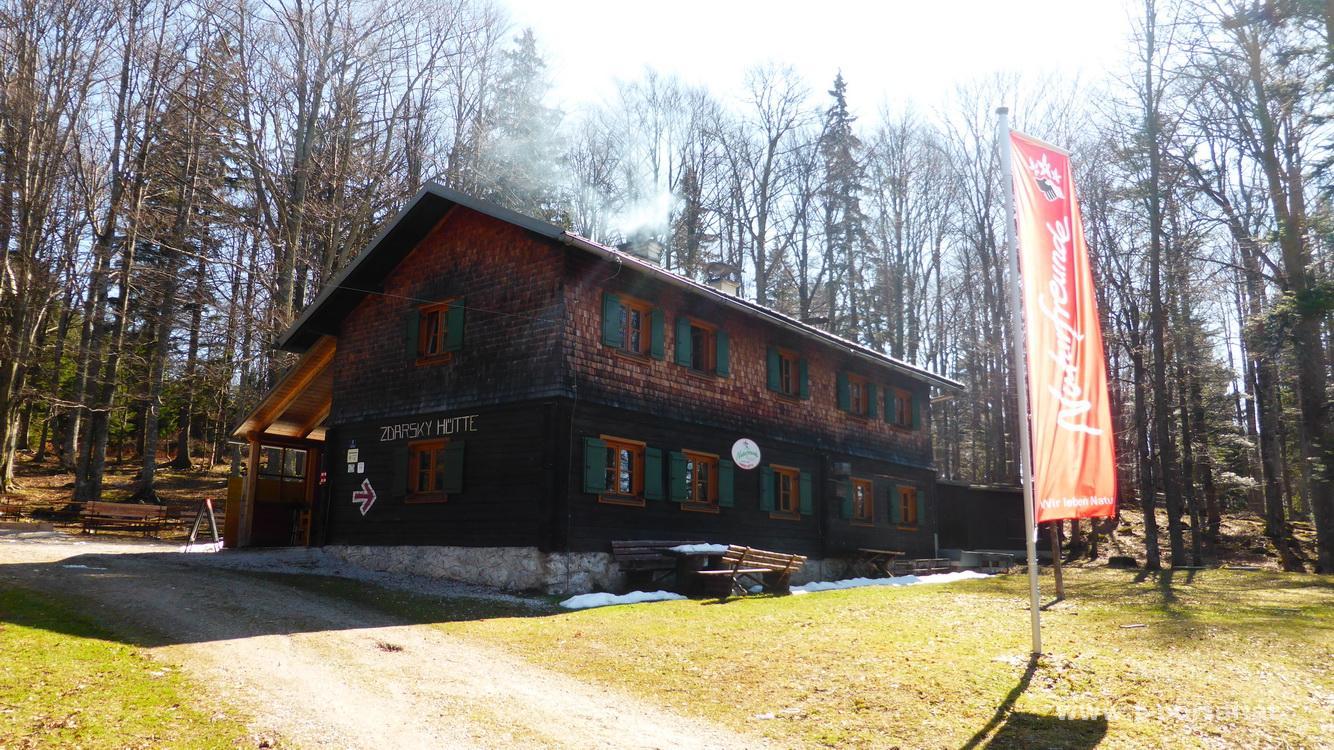 Eine Überschreitung des Türnitzer Högers wollte ich schon länger machen. Hierzu gibt es mehrere Varianten - entweder von Türnitz nach Furthof oder Hohenberg, oder von St. Aegyd zum Höger und dann nach Türnitz oder Furthof. Ich parke bei der Anreise mein Rad in Furthof und starte meine Wandertour in St. Aegyd in der Nähe des Hauptplatzes. Es geht zuerst eine Promenade hinauf, bald hat man Ausblick zu Gippel und Göller. Nun gemütlich im Wald Zick-Zack hinauf, es sind bereits einige Wanderer Richtung Zdarsky Hütte unterwegs. Bald komme ich zur Alm bei der Hoida Hittn, am Waldrand liegen sogar noch einge Schneereste. Gemütlich geht es über die Alm, bis ich die bereits geöffnete Zdarsky Hütte erreiche.