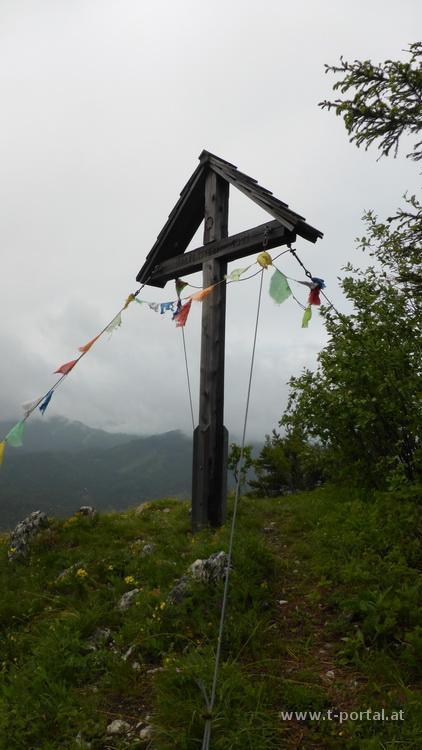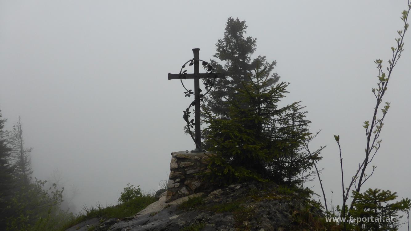 Nach einer Kurve geht es ein Stück durch den Wald und dann über Wiese und Waldweg auf und ab. Nach der Hatscherei durch das nasse Gras treffe ich wieder auf den Forstweg, der mich zur Abzweigung zum Handlesberg und Falkenstein führt. Ich gehe zuerst zum Falkenstein. Am Gipfelkreuz blicke ich tief ins Tal, während ober mir sogar die Sonne raus kommt und der Regen aufhört. Durch die Sonne motiviert geht es ohne große Pause zurück zur Forststraße und weiter Richtung Handlesberg. Nun doch einige Zeit auf der Straße dahin, bis man nach links in den Wald abzweigt. Die Sonne ist schon wieder verschwunden und der Regen ist zurück. Nochmal geht es auf die Forststraße und anschließend über einen Zaun, es sind noch ca. 250hm bis zum Gipfel. Nun beginnt es wirklich zu schütten, ich geb nochmal Gas und hoffe einen Unterstand zu finden, außer ein paar Bäumen und Sträuchern gibt es hier aber nichts. Bald erreiche ich den Kamm und gehe weiter Richtung Gipfel. Der Regen hat wieder etwas nachgelassen, das es recht rutschig ist, wundert wohl keinen.