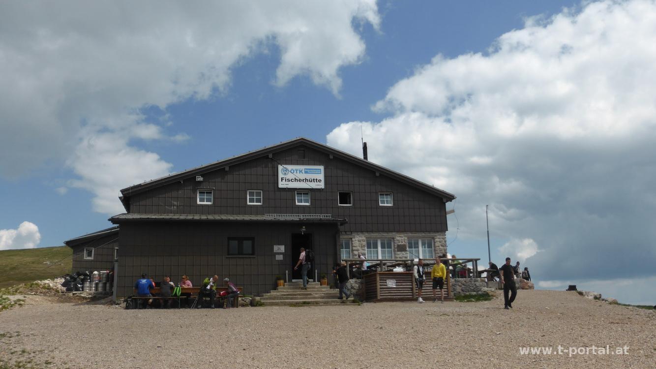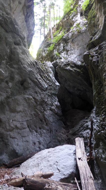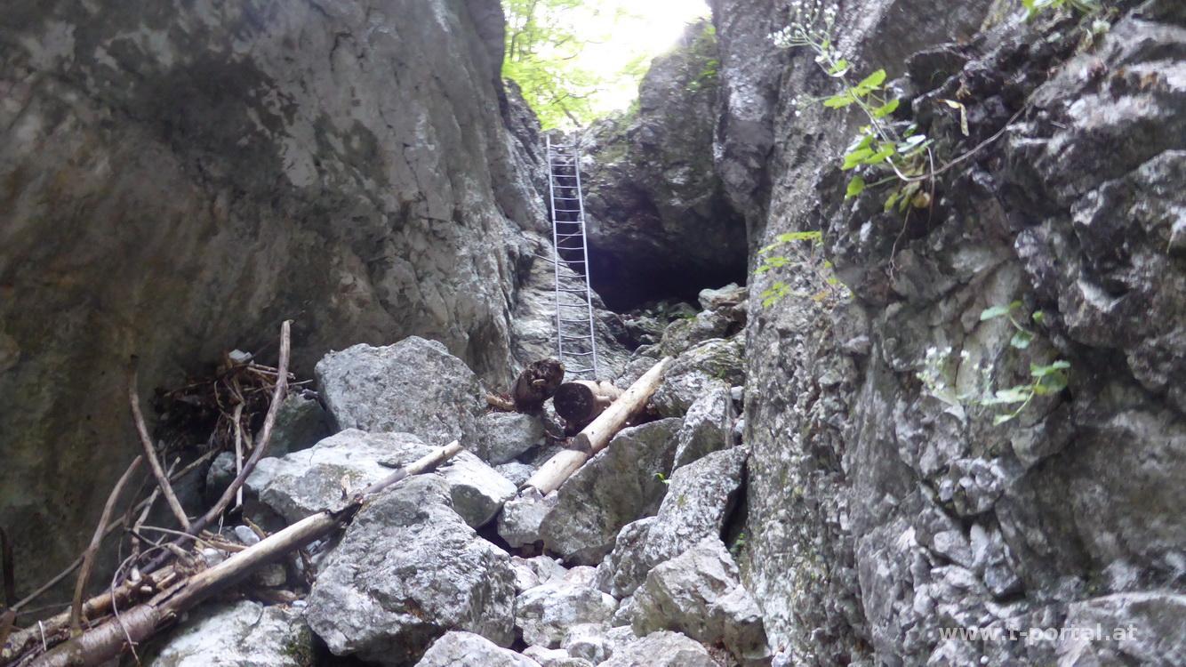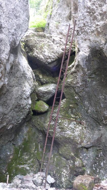 Ich erreiche bald die erste noch kleine Leiter, immer wieder geht es über Baumstämme und Fels bergauf. Nachdem ich in einer Klamm bin, tropft auch hier und da etwas Wasser herab und einige rutschige Stellen sind somit auch dabei. In einige große Felsblöcke sind Tritte herausgeschlagen, Eisenketten helfen beim Aufstieg. Zwischendurch öffnet sich die Schlucht immer wieder, insgesamt müssen ca. 600 Höhenmetern überwunden werden, bis man auf den Normalweg trifft. Nun geht es im leichteren Gelände durch Wald bis zur Kientalerhütte (1380m, offiziell 2h30 Gehzeit). Von hier können noch geübterte über einen B/C Klettersteig den Turmsteig neben der Hütte erklimmen. Ich kaufe mit alternativ ein Erfrischungsgetränk und blicke rüber zum Raxplateau. Nun gibt es mehrere Möglichkeiten um in theoretisch 2-2h30 den Gipfel zu erreichen oder auch den Schneeberg am Grafensteig zu umrunden.