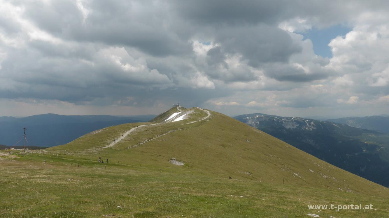Ich wandere zuerst ein Stück den südlichen Grafensteig entlang bis ich zum Fleischer Gedenkstein komme. Hier geht es nach rechts weiter Richtung Gipfel. Am Weg hat man immer wieder die Gipfelaufbauten im Blick. Ich überschreite die Baumgrenze, übergehe den Schauerstein und folge den Eisenstangen bis zum Kaiserstein. Der Ausblick ist für das leicht betrübte Wetter noch ganz gut, den Neusiedlersee kann ich jedoch nicht erkennen. Vorbei an der Fischerhütte geht es weiter bis zum Gipfelkreuz am Klosterwappen. Hier ist erstmal Zeit für eine Rast, bis mich kurz vor zwölf Uhr ein paar Regentropfen treffen. Diese habe ich laut Wetterbericht erst später erwartet, also mache ich mich bald auf den Rückweg durch den Stadelwandgraben. Im Abstieg tröpfelt es immer wieder leicht, aber echter Regen kommt nicht auf. Vom Gipfel geht es zuerst über eine Wiese hinunter, bis ich Latschengebiet erreiche. Nun über Stein und Fels weiter abwärts, bis zur Kreuzung mit dem Grafensteig. Im Wald geht es weiter bis zur Märchenwiese und zum Gipfel der Stadelwand.