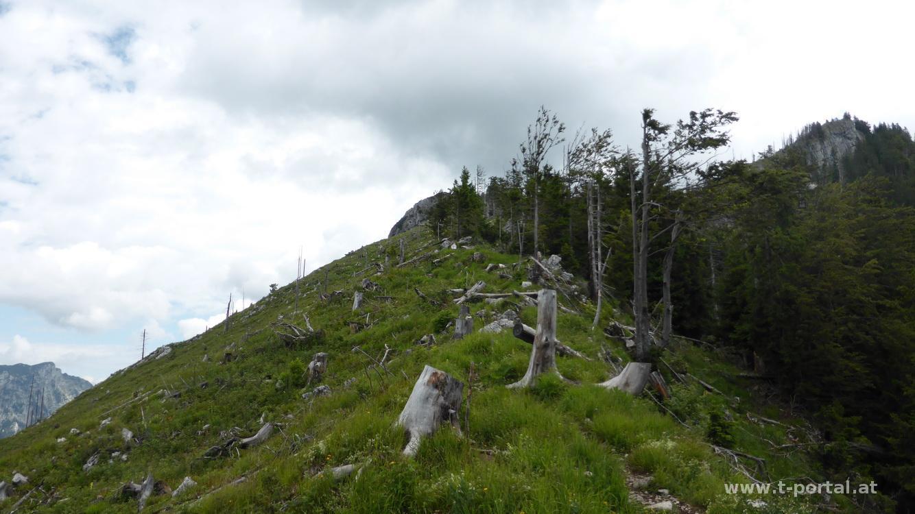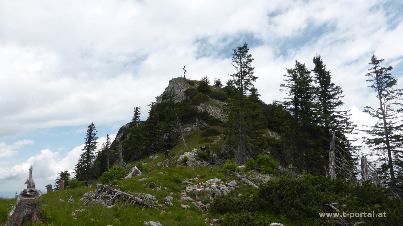 Nach ein paar Minuten ist auch die Almhütte erreicht und ich seh am obigen Waldrand ein paar Hochlandrinder grasen. Diese erblicken mich auch bald und nachdem einige davon im Galopp in meine Richtung kommen, hüpf ich lieber über den Zaun zur Almhütte. Hier warten auch schon andere Wanderer, ich prüfe kurz das Kartenmaterial und gehe auf der Forststraße weiter. So wandere ich bis zum Traunseeblick, dann wieder am Wanderweg Richtung Erlakogel. Der Aufstieg ist inzwischen weniger steil als am Anfang und ich erreiche bald die vom Sturm zerstörte Gipfelgegend. Über Steine, Wiesen und neben ein paar Walderbeeren vorbei geht es bis zum letzten Gipfelanstieg. Nun noch über ein paar Felsen unter zu Hilfenahme der Hände zum Gipfelkreuz.