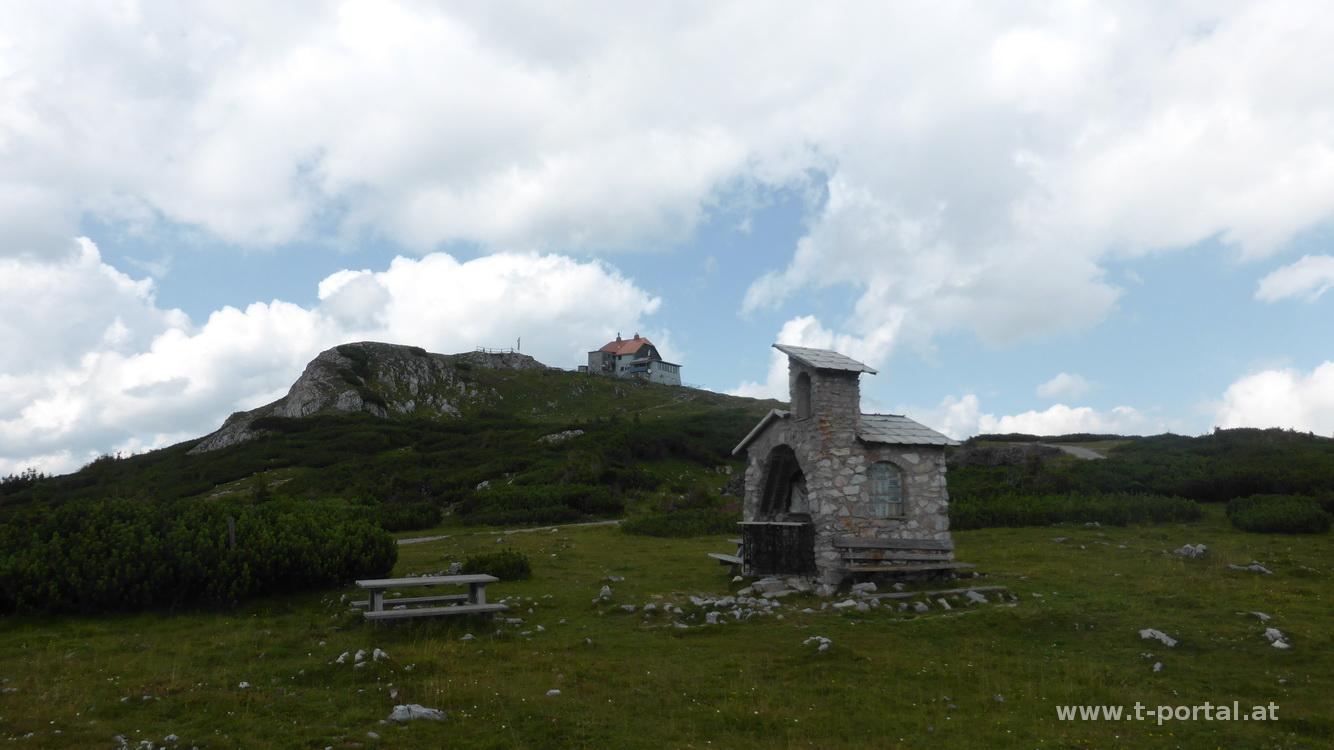 Nach der Pause mache ich einen Abstecher rauf zum Amaissbichl und blicke rüber zur Rax und den Nasskamm. Danach geht es wieder zurück Richtung Hütte und dann neben und auf dem Fahrweg Richtung Westen. Nach ein wenig Hatscherei und leichtem Anstieg biege ich auf die Wiese ab und mache mich an den Anstieg zum Windberg. Am Gipfel angekommen ist es heute gar nicht so windig, bei der Hitze gibt es aber leider auch nicht so viel Aussicht. Vom Gipfel aus mach ich noch ein kleine extra Runde, um einen Geocache in der Nähe des Karlecks einzusammeln (nichts für schwache Nerven). Anschließend geht es vorbei an der Michlbauerhütte zum Schneealpenschutzhaus. Auch hier ist wenig los und ich kann in Ruhe meinen Almdudler trinken. Nach einem Abstecher zur Kapelle geht es weiter ins Tal.