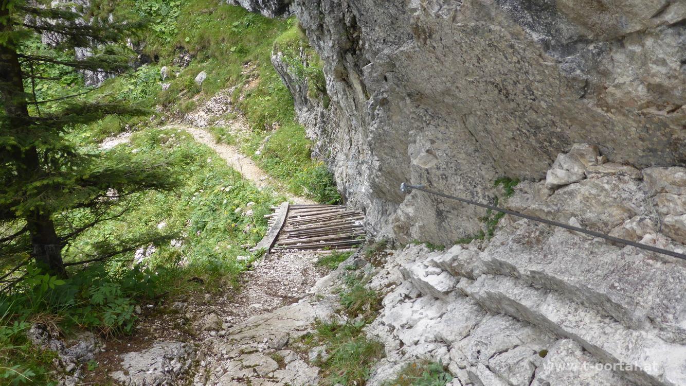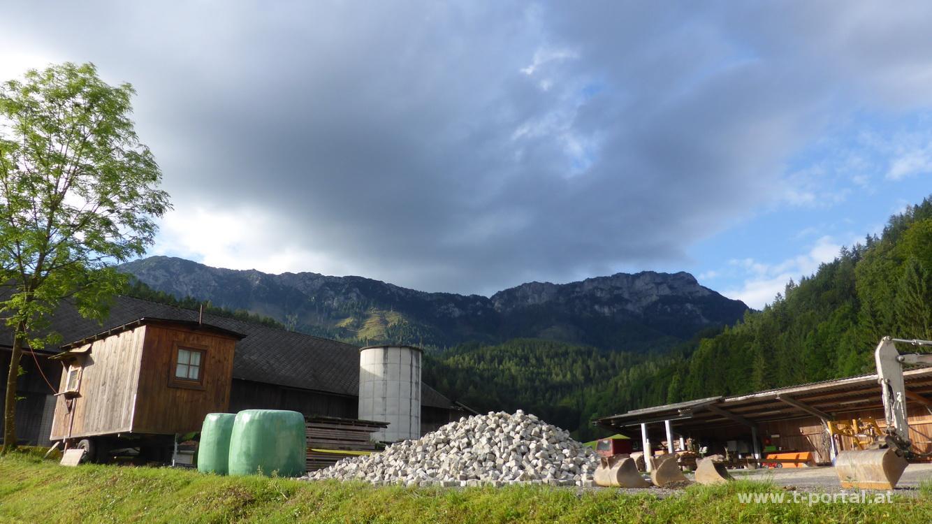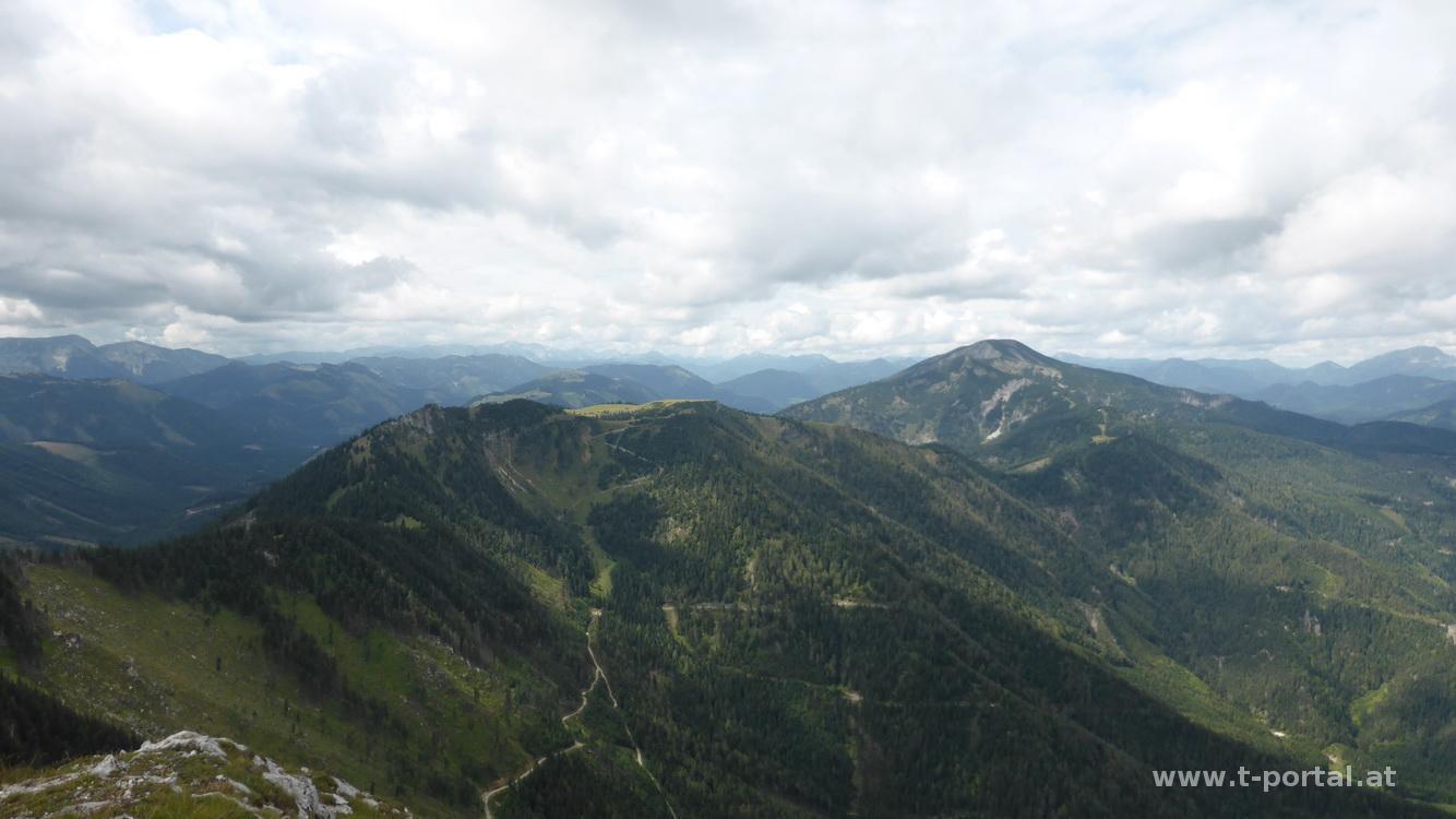 Hier trag ich mich ins Buch ein, blicke in die Gegend auf einen Haufen Wolken, die Richtung Rax schon dunkler werden und verputze meine Jause. Püntklich um 12.00 spüre ich ein paar Regentropfen und so mache ich mich kurz darauf auf den Rückweg. Es bleibt vorerst bei ein paar Tropfen und so komme ich bald wieder zum Gippeltörl. Hier treffe ich auch die ersten Wanderer des Tages, die gerade den Treibsteig rauf kommen. Dieser ist derzeit wegen Waldarbeiten gesperrt (bis Anfang September), nachdem heute aber nicht gearbeitet wird, gehe ich trotzdem hier runter. Während Arbeitszeiten wär das sicher nicht möglich. Der Name des Treibsteig kommt vom Almauftrieb und ist somit zum Abstieg gemütlicher zum Gehen als die Variante über den Schwarzauer Gippel. Nach etwa einer Stunde Abstieg fängt es zum Nieseln an, das ist aber auch nach ein paar Minuten wieder vorbei. Nach einigen Forststraßenquerungen bin ich nach gut 90 Minuten Abstieg vom Gippel wieder im Tal angekommen. Ich zieh mich um, packe meine Sachen und fünf Minuten nach Abreise beginnt es richtig zu schütten. Somit ein optimales Timing auf einer sehr einsamen Tour.