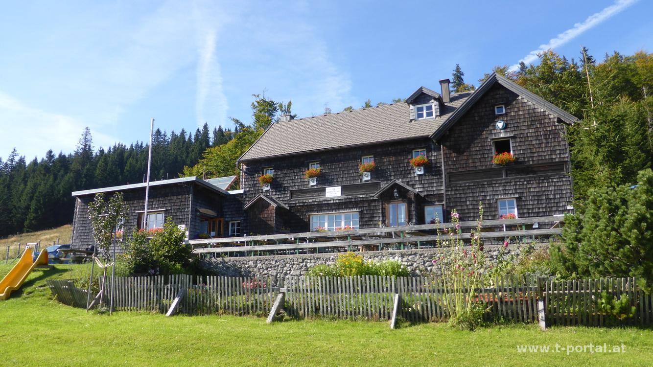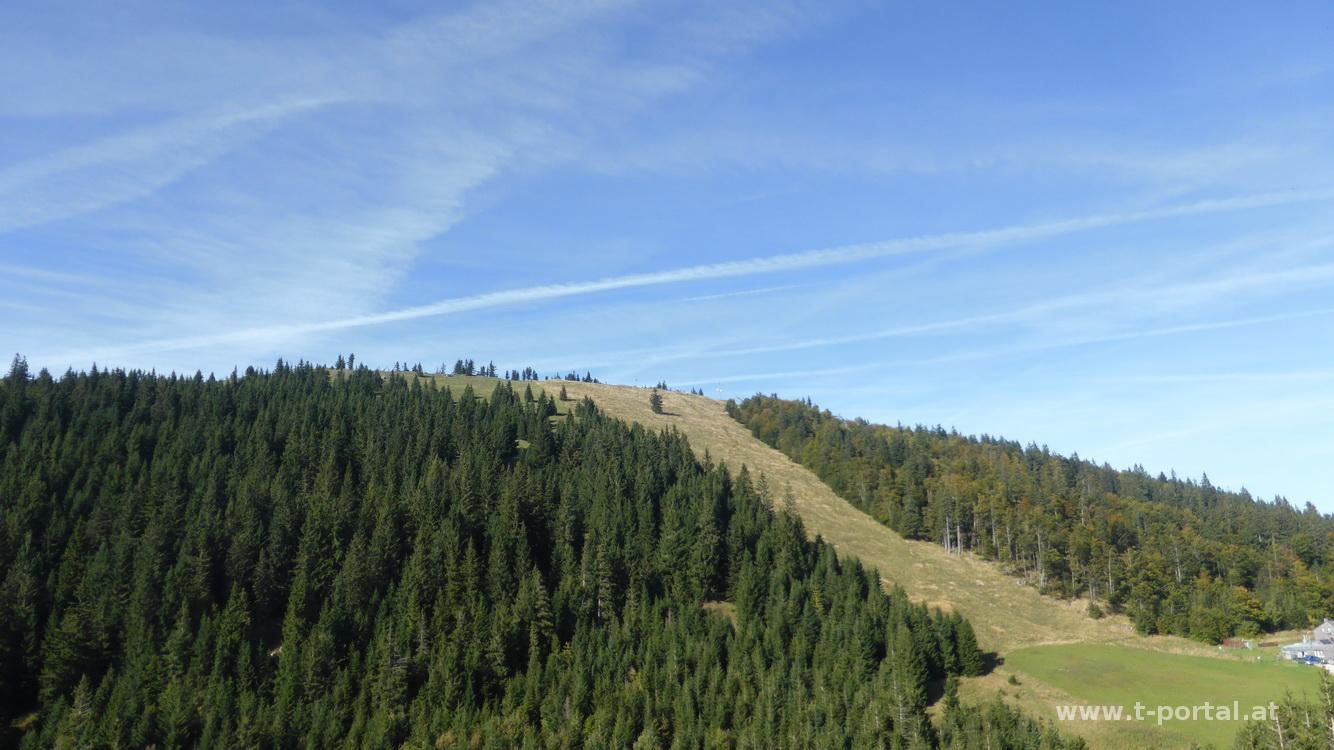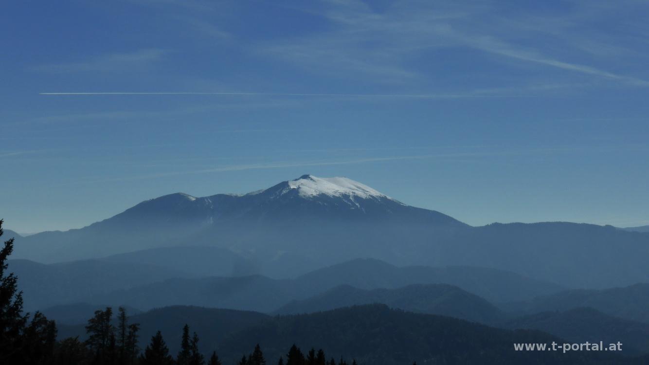 Oben angekommen gibt es schönen Ausblick in den Süden, die höheren Berge (Schneeberg bis Göller) sind bereits mit Schnee angezuckert. Ich kürze über die Wiese ab und gehe oben herum bis zum Gipfelkreuz. Nach kurzer Aussichtspause geht's runter zum Schutzhaus für die Mittagspause. Nachdem die Sonne so wunderbar scheint bleibe ich heute länger sitzen. Anschließend schaue ich noch in der Kirche Maria Einsiedl und am Felsen dahinter vorbei. Retour geht es dann zuerst ein Stück auf der Forststraße und dann auf bekanntem Weg zurück zum Ausgangspunkt.