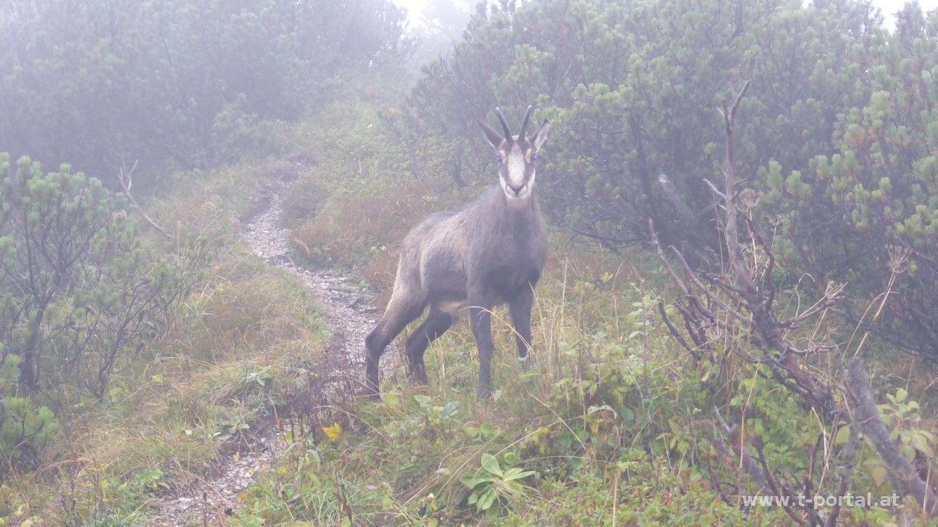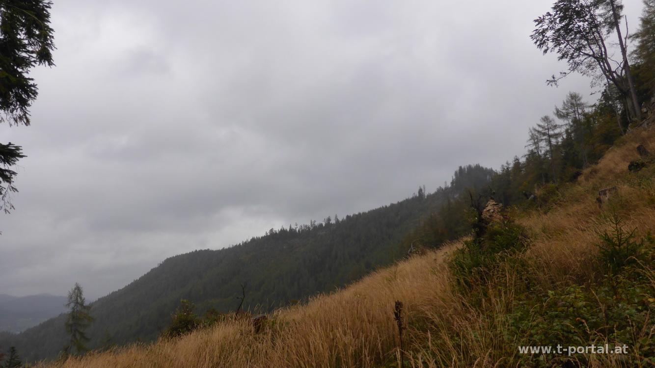 Vom Köckensattel geht es bergauf und vorbei am Feldhütl. Ein Stück durch flachen Waldweg und dann steiler hinauf zum Oischingkogel. Danach etwa 50hm hinab und gleich wieder hinauf auf den vorderen Zellerhut. Im Aufstieg treffe ich ein Gämse am Weg, die nicht recht weiß, wohin sie flüchten soll. Ich mach ein paar Schritte zur Seite in die Latschen, worauf sie an mir vorbei zischt und mich von unten erstaunt anblickt. Nun folgt der erste Abstieg des Tages bis unterhalb des Hüttenkogels. Zur Hütte beim Hüttenkogel geht es vorbei an einer Quelle ein Stück hinauf. Hier stelle ich mich erst mal unter und trinke meinen warmen Tee. Der Regen wird nochmal mehr, ich mache mich bald auf den Weiterweg, um rasch wieder zurück ins Tal zu kommen. Vom Hüttenkogel folgt der Aufstieg zum Mittleren Zellerhut. Hier geht es auf der einen Seite ziemlich hinunter, durch den Nebel sehe ich davon heute nicht so viel. Nach einer kurzen flachen auf/ab Passage liegt nur noch der Weg über rutschige Erde und Steine bis zum Gipfelkreuz am großen Zellerhut vor mir. Im Regen schreibe ich mich schnell ins Gipfelkreuz und mach ein paar Fotos des grandiosen ;-) Ausblicks.