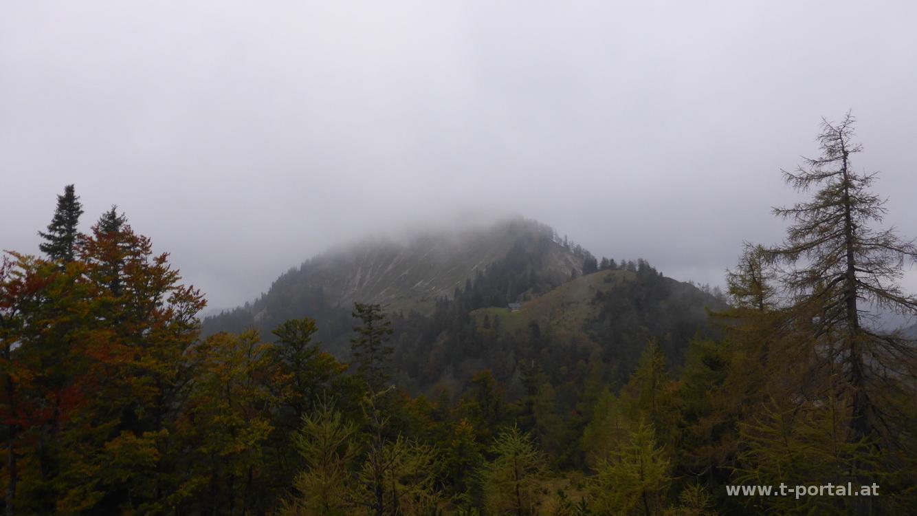 Die gleiche Tour habe ich bereits letztes Jahr gemacht, heute wiederhole ich diese hauptsächlich wegen einer Geocachereihe. Heute bin ich früh aufgestanden und starte gegen 7:30 in Grünau beim ehemaligen Hotel Marienwasserfall. Während der Anreise war nur die Straße nass, zu Beginn nieselt es leicht. Im Wald ist es um die Zeit bei dieser Bewölkung noch ziemlich düster und direkt etwas gruslig. Das Röhren im Wald (ich hoffe es war ein Hirsch) macht es nochmal spannender. Nach dem ersten Anstieg geht es ein Stück über eine Forststraße, bevor ich wieder auf den Waldweg und mehr oder weniger Steil bergauf wandere. Das Laub am Weg ist rutschig, nachdem es aber großteils rauf und nur ein paar mal kurz hinunter geht, ist das ziemlich egal. Am letzten Stück zum Köckensattel gibt es ein paar steilere Anstiege, nach einer knappen Stunde habe ich den Sattel erreicht. Aus dem Nieseln ist inzwischen doch ein dauernder Regen geworden, also schlüpfe ich schnell in die Regenjacke und mache mich auf den Weg zum Kamm.