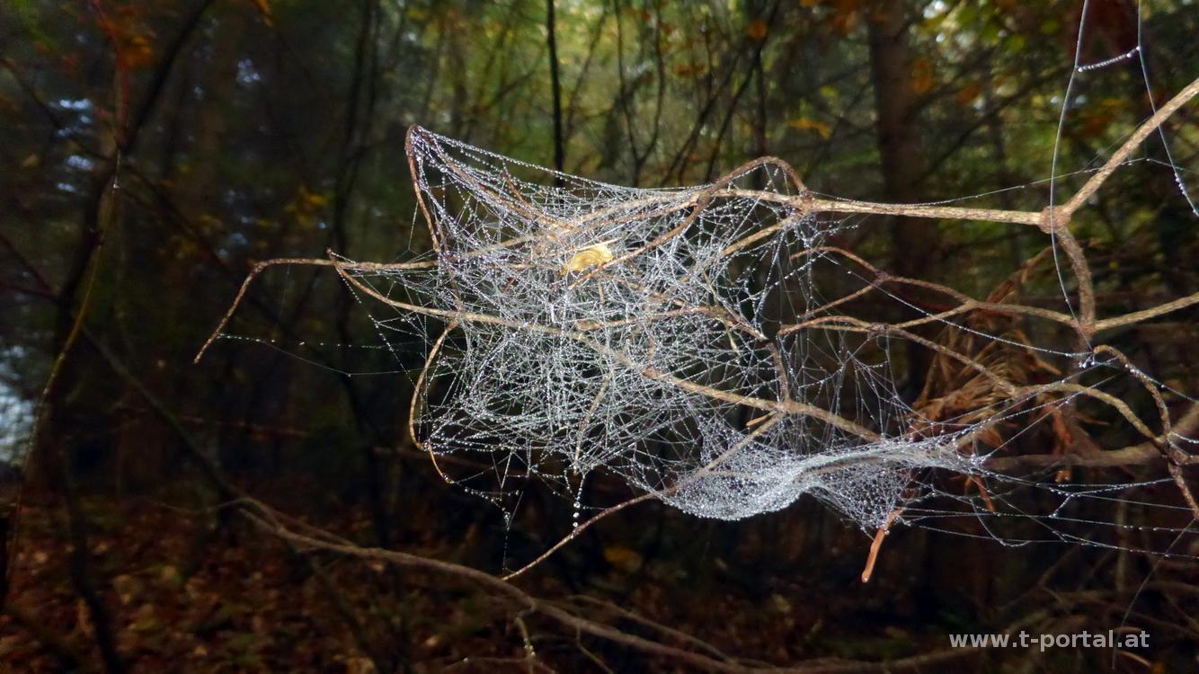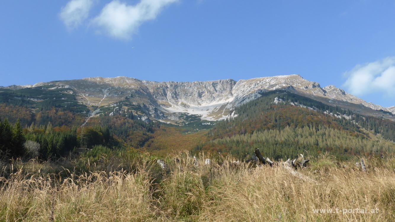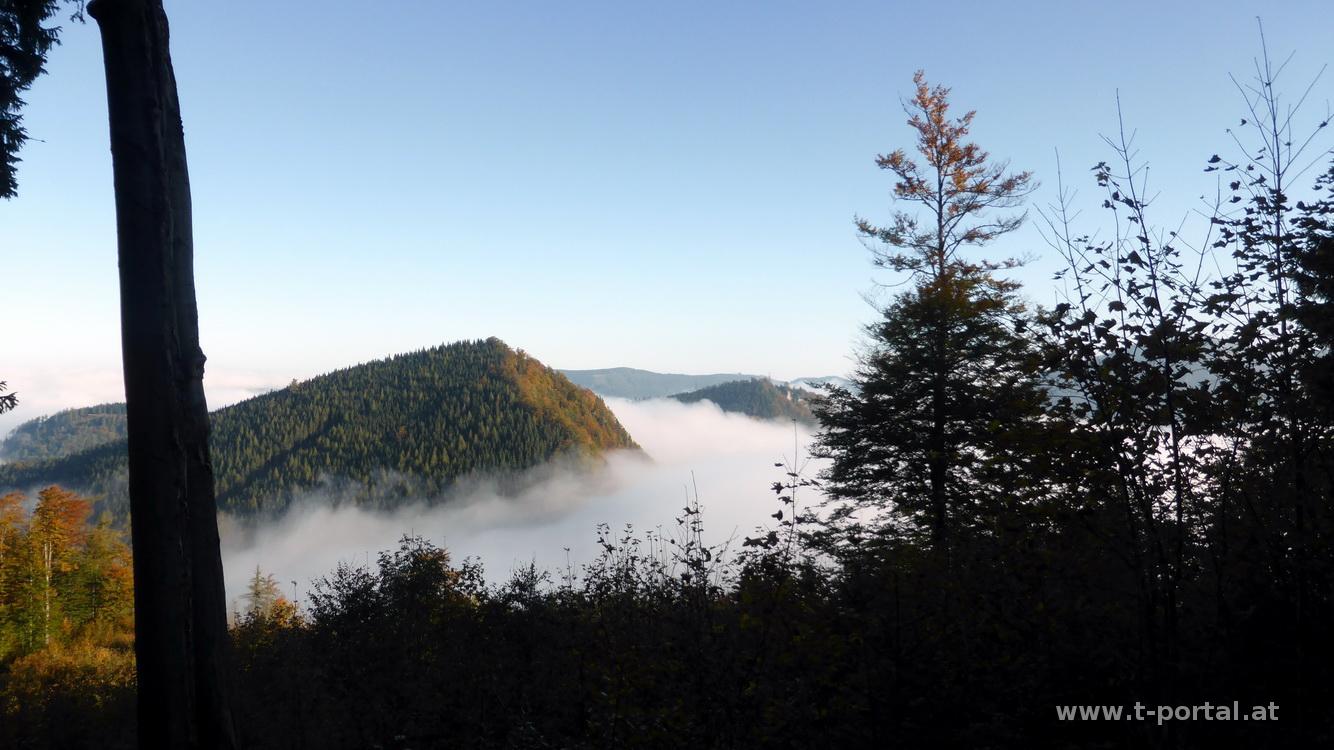 Los geht's trotzdem früh, kurz vor sieben Uhr starte ich am Parkplatz in Erlaufboden. Ich folge zuerst der Panoramastraße die mich auf Asphalt, vorbei am Kraftwerk Erlaufboden und am Holzknechtmuseum, bis runter zur Erlauf führt. Noch ist's ziemlich frisch, mein Auto hat mich bei der Herfahrt vor Eis gewarnt :-). Neben einem großen Parkplatz (alternativer Startpunkt) geht es auf einer Forststraße entlang, die mich nach einem Linksknick an ein paar Häusern von Trübenbach vorbeiführt. Wenig später rechts hinunter und auf einer Brücken über einen trüben Bach und dann ab in den Wald. Hier ist es, wie für Jahreszeit und Wetter üblich, schlammig und so rutsche ich weiter hinauf. Ein paarmal quere ich die Forststraße, die wohl zum gleichen Zwischenziel führt, nämlich nach Bärenlacken. Vorher wandere ich jedoch noch durch ein nebelverhangenes Waldstück, das um die Uhrzeit doch etwas mystisch ist. In Bärenlacken angekommen treffe ich auf einige Wanderer, die von Raneck kommen. Nun beginnt der bekannte Anstieg im Wald zum rauhen Kamm. Bald überschreite ich die Nebelgrenze und ein toller Ausblick auf die Herbststimmung und die weitläufigen Nebelschwaden im Tal wird sichtbar.