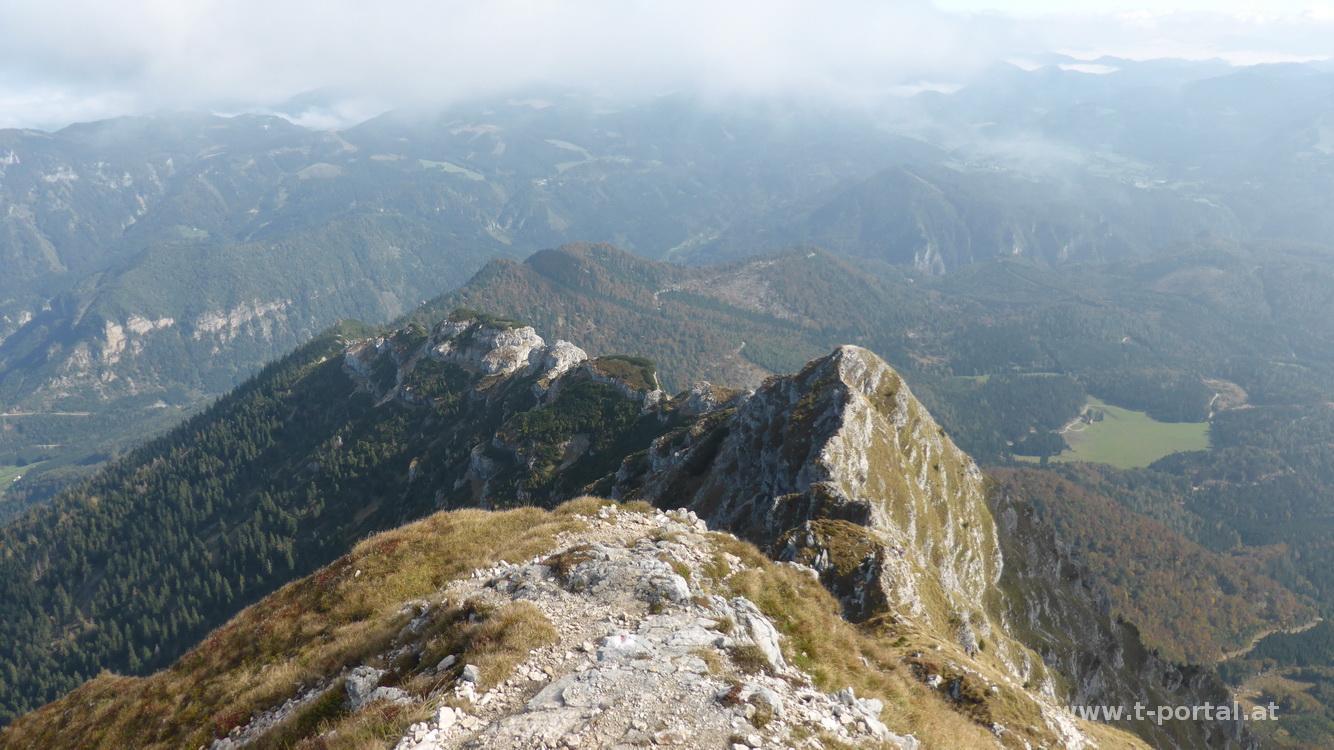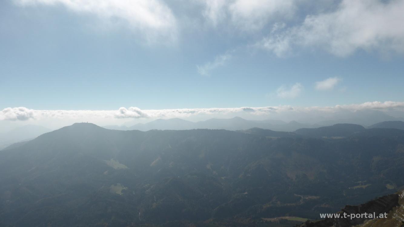 Nur noch ein Stück fehlt bis zum Gipfelkreuz. Nachdem hier viele Leute für ein Foto anstehen, verzichte ich darauf und pausiere nur kurz. Am heutigen Ausblick beeindruckt die Wolkendecke Richtung Norden und die Nebelwand, die sich etwa hinter dem Hochschwab auftürmt. Flotten Schrittes geht es runter zum Schutzhaus, wo ein ordentliches Mittagessen ansteht. Nach längerer Pause geht es im Sonnenschein runter zum Riffelsattel und von hier zuerst direkt über eine Wiese und dann im Wald gemütlich hinab bis zu einer Forststraße. Dies führt mich nach einem Rechtsknick zu einer T-Kreuzung, bei der ich links abbiege und am Spielbichler Haus vorbeispaziere. Es folgt ein unspannender Weiterweg auf der flachen Forststraße bis zum Abzweiger in die Ötschergräben. Alternativ ging es hier gerade aus zum Jägerherz, von dem der Weg, der an den Höhlen vorbei zum Kamm führt, beginnt. Der Abstieg in die Ötschergräben führt durch Wald und mit ein paar rutschigen Passagen runter zum Schleierfall. Achja - einen Bach gab es auch zum Überqueren.