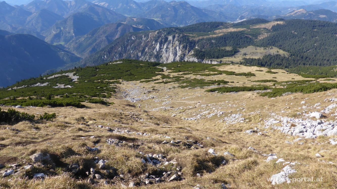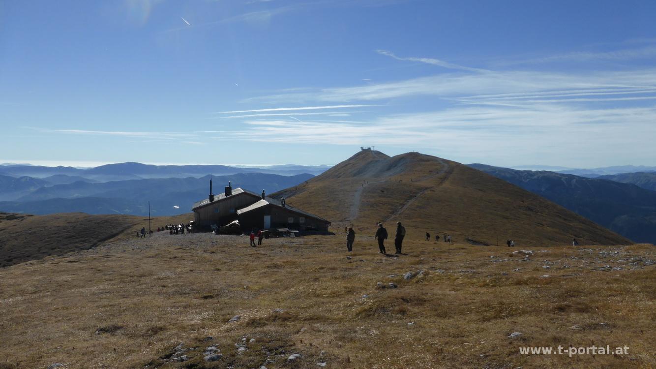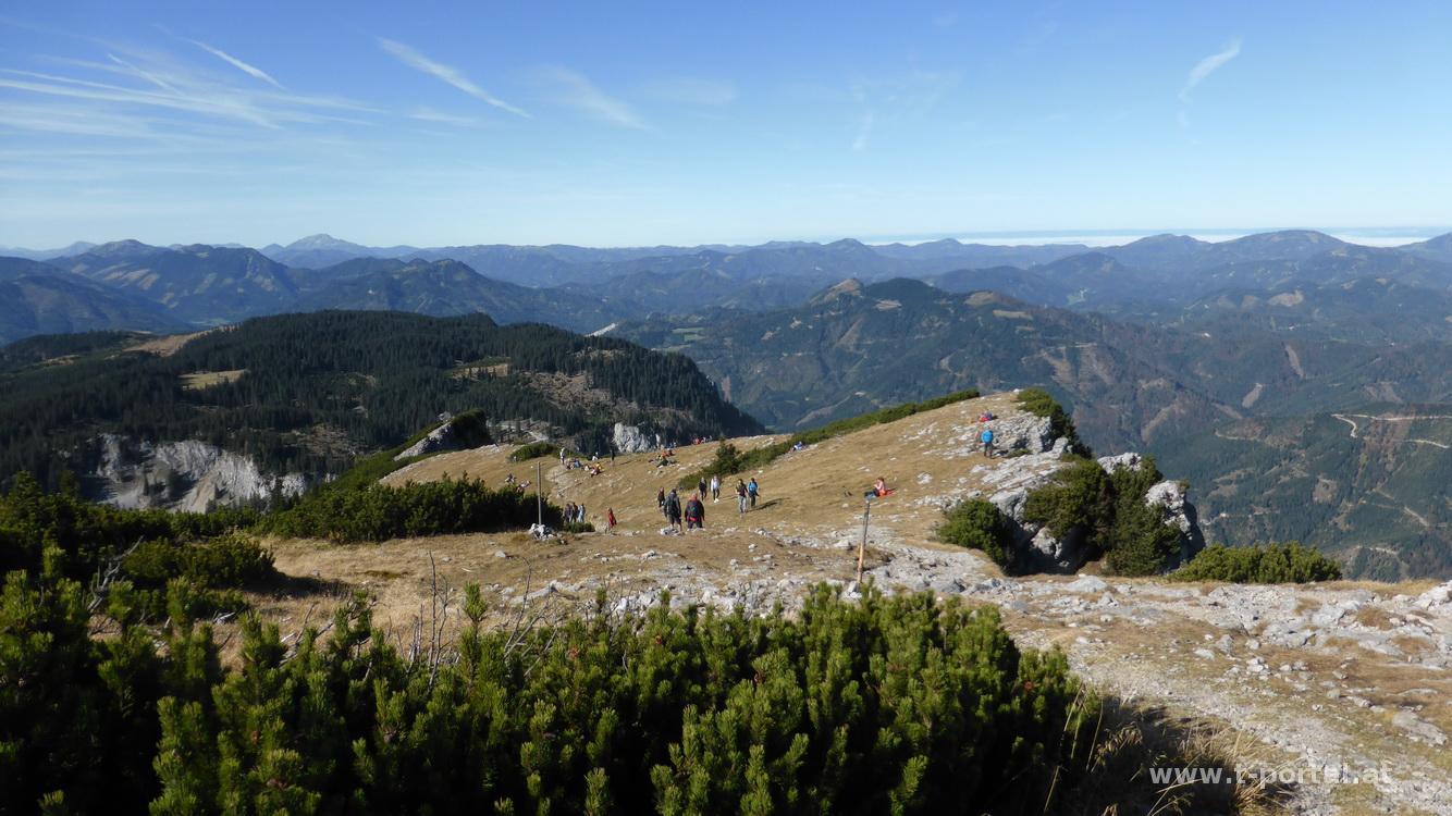 Am Schneeberg war ich dieses Jahr zwar schon, aber mit der Menge an Wegen und Steigen, die hier hinauf führen, könnte ich mich wochenlang beschäftigen. Ich starte meine Tour am Klostertaler Gscheid beim Wegscheidhof. Ein Forstweg führt gemütlich bergan, genau das Richtige zum Warmwerden. Zwischendurch wechsle ich auf Waldwege und dann wieder auf Forststraßen und wandere so an der Putzkapelle vorbei weiter bis zu einer Wegkreuzung. Nun geht es im Wald über Laub etwas steiler hinauf, jahreszeitbedingt ist es etwas gatschig. Nach einigen Höhenmetern erreiche ich die Edelweißhütte, wo die Menschenmengen vom Salamander-Sessellift herauf kommen. Anfangs noch durch Wald dann über Stein führt mich der Fadensteig Richtung Gipfel. Während ich bis zur Hütte nur wenigen Wanderern begegnet bin, ist hier deutlich mehr los und ich schlängle mich mal mehr, mal weniger schnell hinauf. An ein paar Stellen nehme ich die Hände zur Hilfe, ein Stück ist auch mit Drahtseil gesichert.