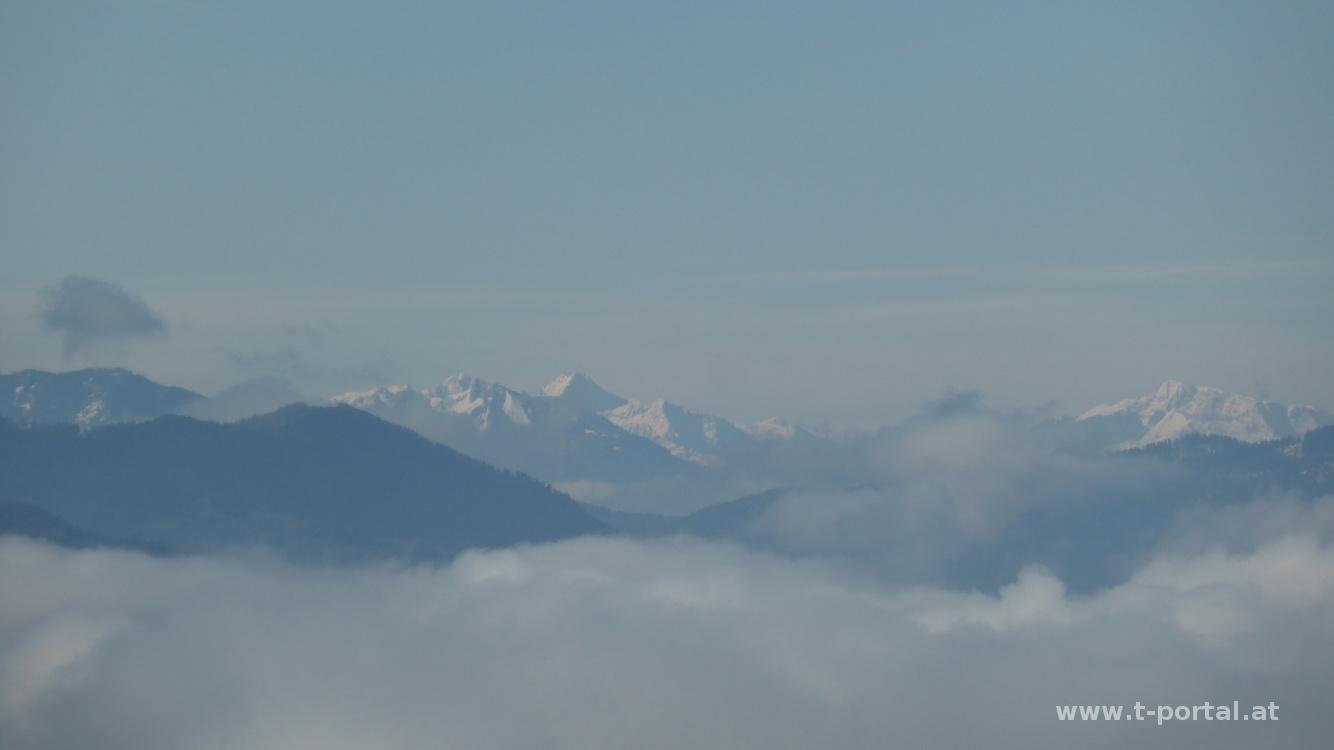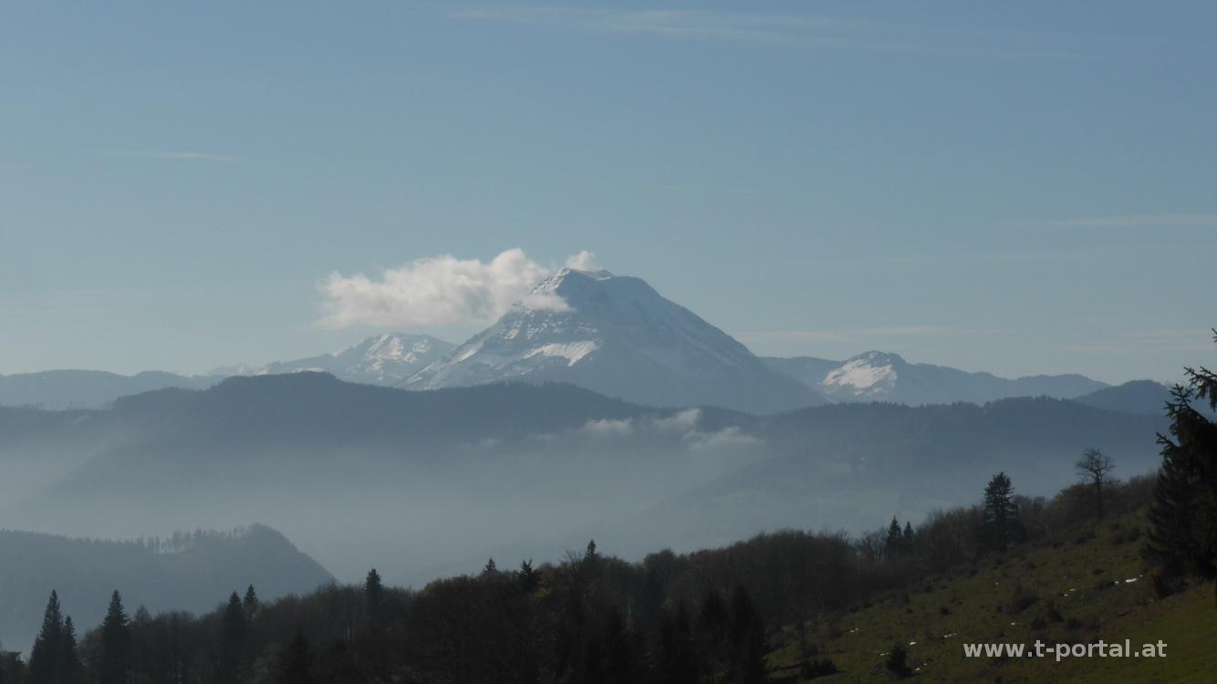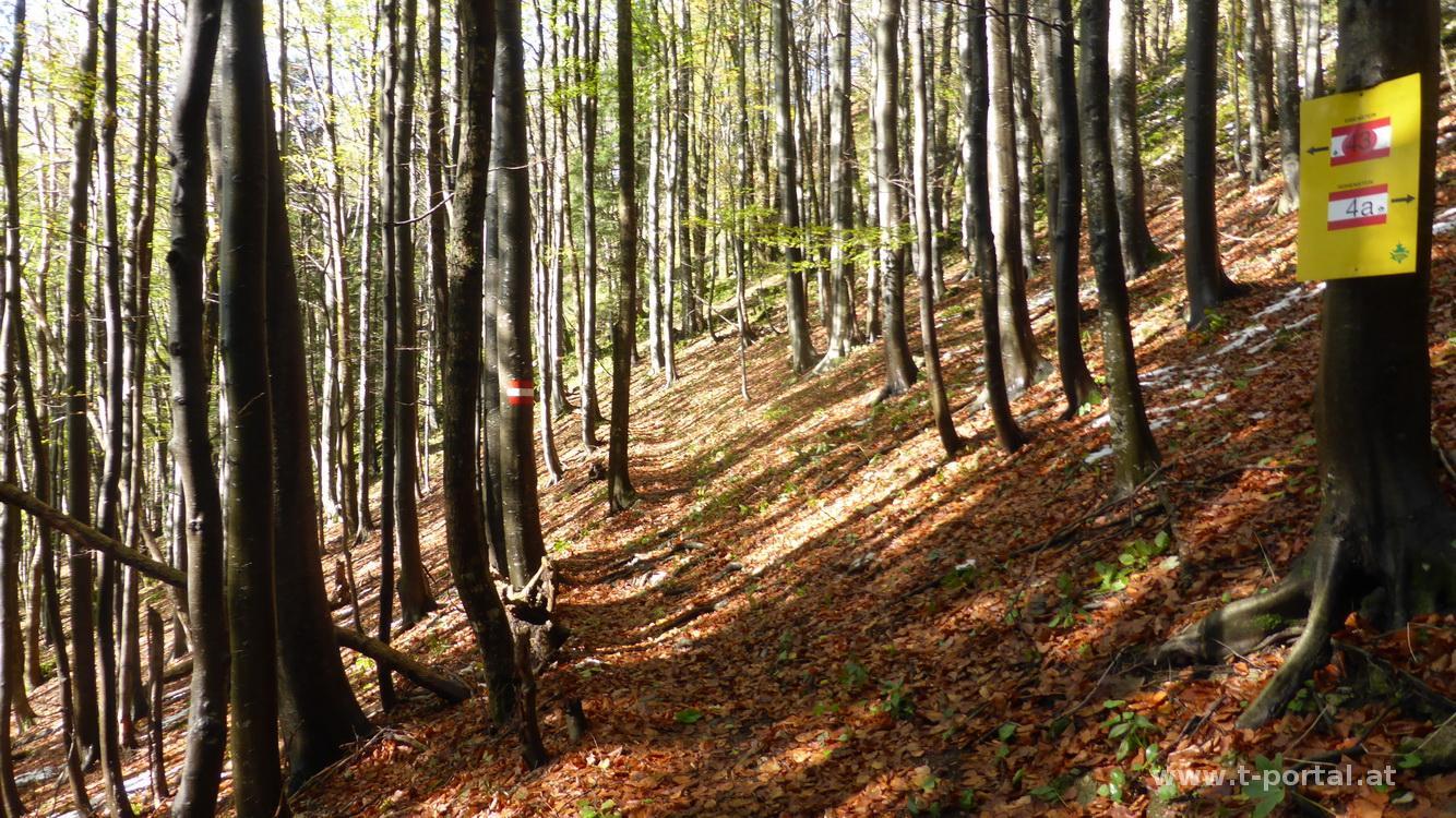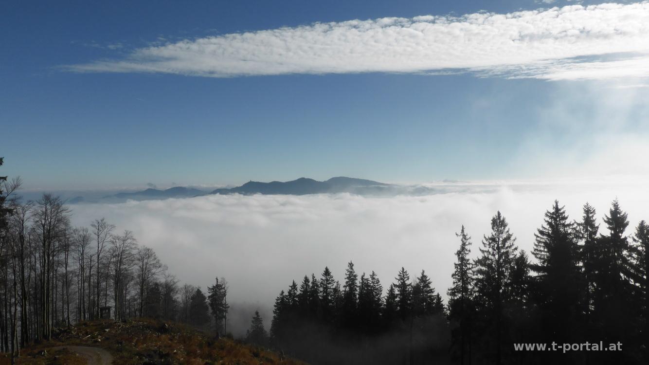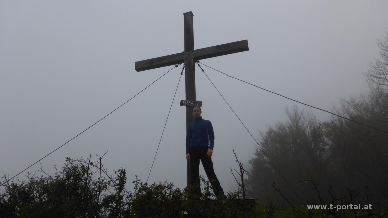 Der Schnee ist ins Land gezogen, somit suche ich mir für das Wochenende eine gemütliche Tour in nicht ganz so hohe Lagen, da ich noch keine große Lust auf's Schneestapfen habe. Vor ein paar Wochen hab ich bei einer Radrunde die Wegweiser zum Himmel und Hohenstein in der Nähe von Schrambach/Lilienfeld gesehen, somit bastle ich mir eine Gipfelüberschreitungstour bis zum Eisenstein und nach Türnitz. Los geht's an der Zögersbachstraße, hier geht es über eine kleine Brücke und dahinter gleich hinauf. Nach dem Regen der letzten Woche ist das Laub und die Erde darunter nochmal ein Stück rutschiger, also kämpfe ich mich langsam den Ratzenzecksteig aufwärts. Über mir hängt der Nebel, nachdem er immer dichter wird, hoffe ich bald raus zu kommen. Nach einigem Anstieg wird es flacher und so wandere ich durch teilweise ziemlich düsteren Wald, bis ich eine Wiese erreiche. Ich weiche etwas vom Weg ab und finde im Nebel das Gipfelkreuz am Himmel. Nun geht es hinab zum Himmelbauer und ein Stück auf einer Forststraße dahin. Bald biege ich wieder in den Wald ab. Der weitere Weg ist wegen Forstarbeiten nicht gänzlich passierbar, nachdem heute aber keiner arbeitet umgehe ich die Baumstämme einfach - ansonsten wäre ich auf die Forststraße ausgewichen.