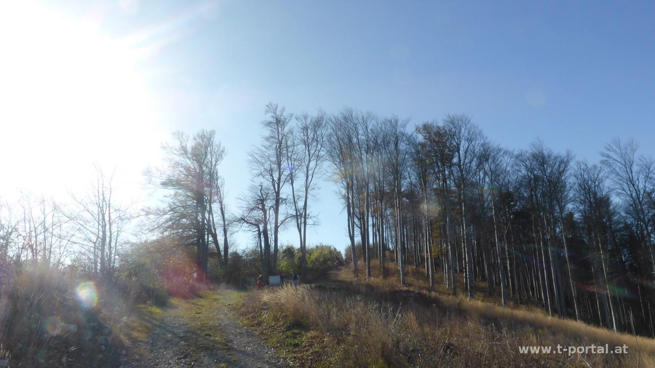 Wenn man um die Jahreszeit nicht früh startet, gibt es nur eine kurze Tour. Somit geht es heute von Altenmarkt an der Triesting auf's Hocheck. Ich parke mein Auto bei der Feuerwehr und wandere von dort einen Forstweg hinauf. So geht im Nebel vorbei am Heimkehrerbründl, zwischendurch ein Stück durch den Wald und großteils auf Forststraßen dahin. Nach einigem hin und her seh ich etwas Sonne und verlasse irgendwann die Nebelgrenze. Dann treffe ich auf den Weg, den ich später zurück gehen werde und spaziere so weiter bis hinauf aufs Hocheck. Das Schutzhaus ist seit Juli geschlossen, somit geht es gleich hinauf auf die Warte wo ich hinab auf viel Nebel blicke, die Fernsicht ist nicht so berauschend.