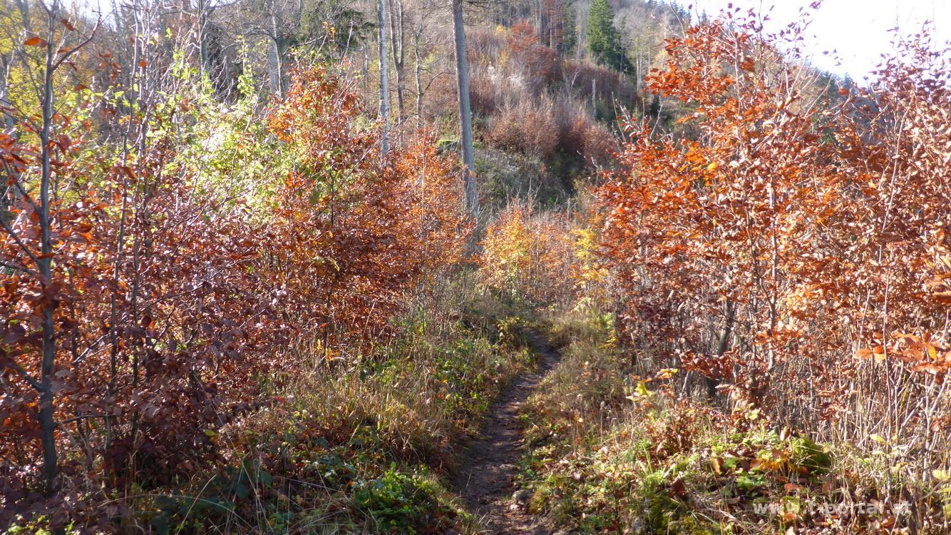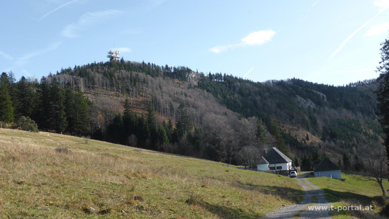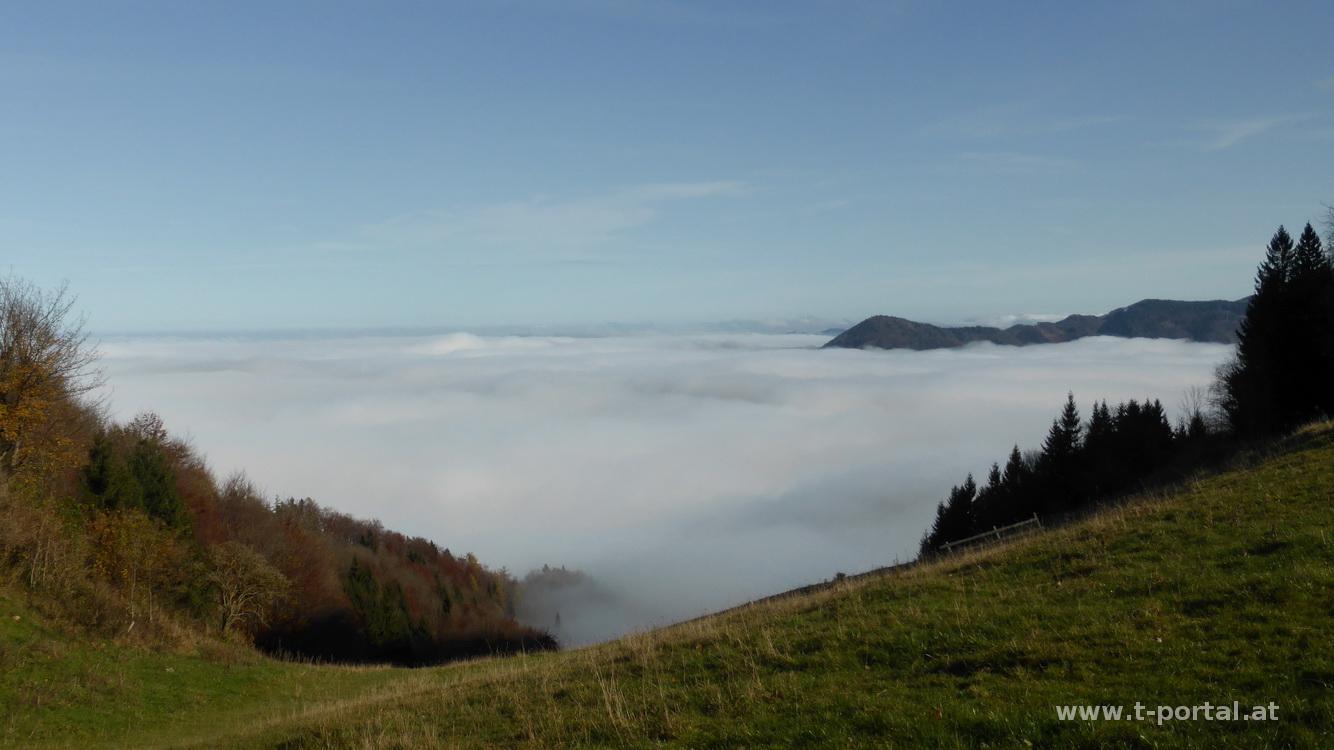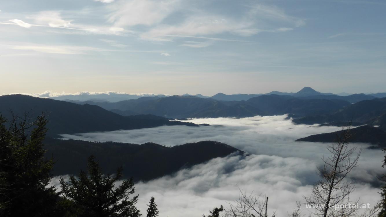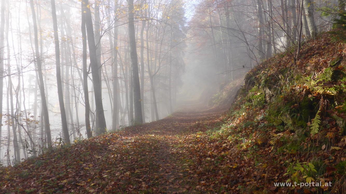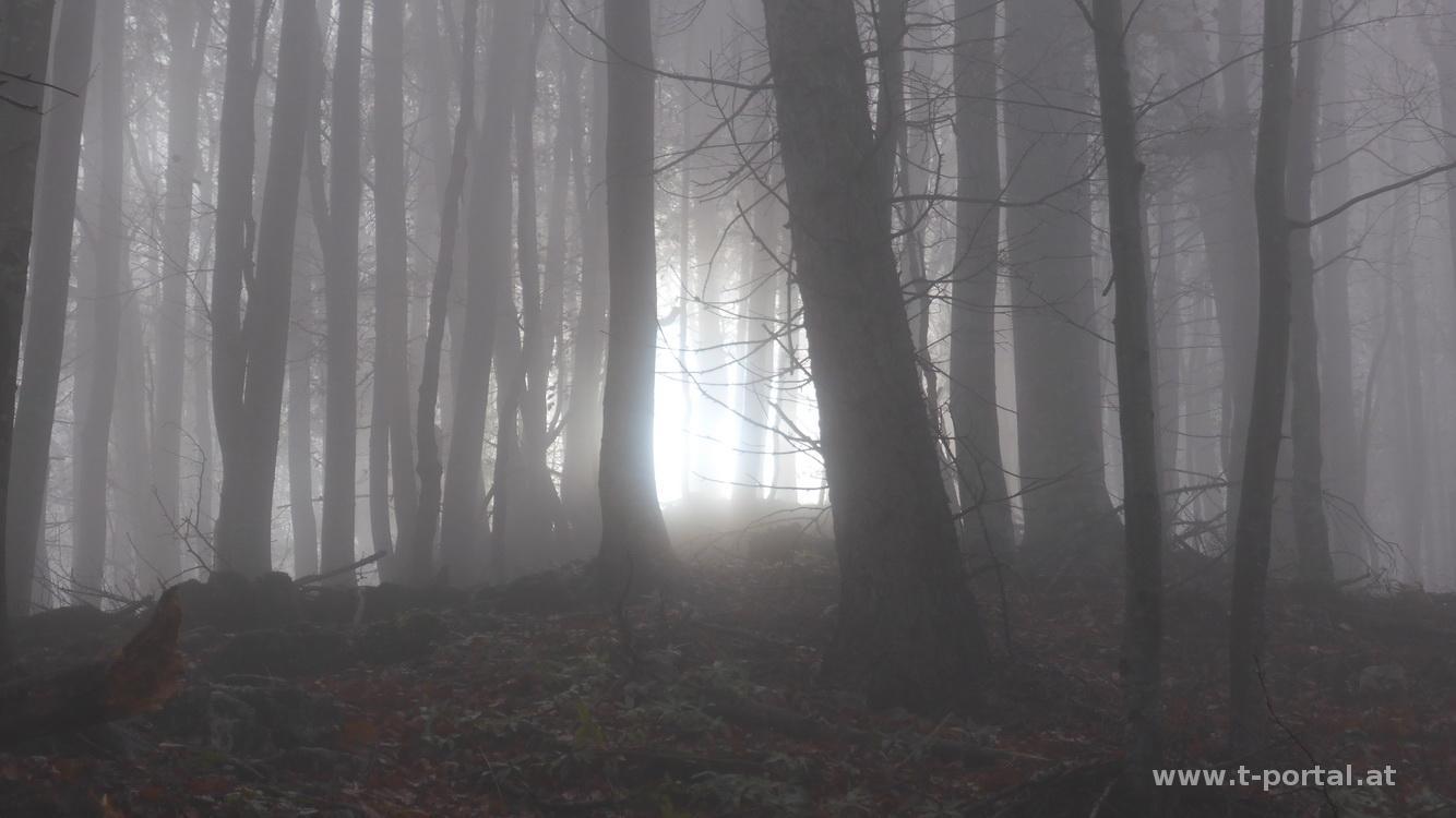 Auch heute ist sonntägliches Sonnensuchen angesagt und somit geht es wieder Mal auf Muckenkogel und Hinteralm. Hierzu suche ich mir einen neuen Aufstiegsweg und starte meine Tour ein Stück hinter dem Lilienfelder Krankenhaus im "Stillen Tal". Ein Stück die Forststraße nach Süden, dann gleich nach links hinauf dem Wegweiser Richtung Ulreichshöhe folgend. Nun über einen Haufen Laub flach dahin, bis zu einer Abzweigung nach rechts. Es folgen einige Kehren und nach etwas Anstieg bin ich auch schon bei der Warte auf der Ulreichshöhe. Schönen Ausblick auf Lilienfeld gibt es hier jedoch keinen, ich befinde mich, wie so oft in letzter Zeit, mitten im Nebel. Es geht ein Stück zurück bis zu einem Wegweiser auf den Spitzbrandkogel. Der ist besonders wegen der der Sage über den Teufel und den Baumeister des Stifts von Lilienfeld bekannt: Dieser hatte dem Teufel seine Seele versprochen, wenn der Bau glücklich vollendet wird. Nachdem dies der Fall war verschleppte der Teufel den Baumeister, der sich in der Kirche verstecken wollte, auf den nahen Berghang. Hier schlug der Teufel mit seinem Schwanz so wild um sich, dass ein breiter Winkel im Wald ausgebrannt wurde. Dieser ist noch heute sichtbar und in der Nähe soll sich der Teufel mit dem Baumeister durch eine Spalte in die Hölle abgesetzt haben.