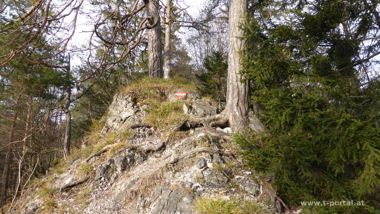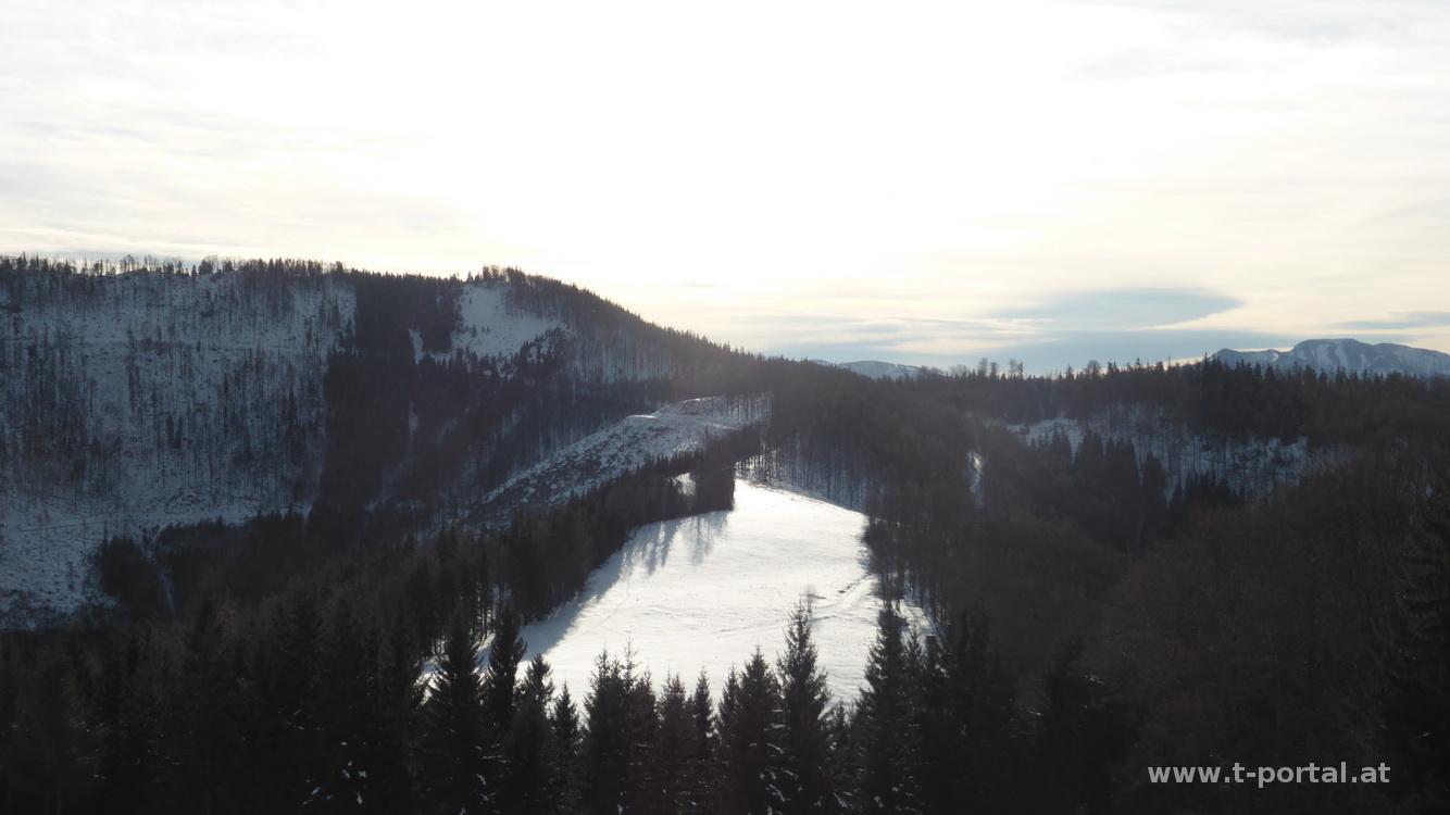 Von hier geht es zuerst ein Stück hinunter, hier treffe ich erstmals auf ein paar Wanderspuren im Schnee. Diesen folge ich bis zum Högeranstieg, wo sie wieder im Wald verschwinden. Ich wähle den Normalanstieg auf der Wanderroute und stapfe durch den Schnee bis zum Gipfelkamm. Hier habe ich tolle Aussicht vom Schneeberg bis zum Toten Gebirge. Nur noch ein Stück Weg trennt mich von der Türnitzer Hütte und dem Gipfelkreuz, das ich bald erreicht habe. Nach Fotorunde jausne ich etwas in der Sonne vor der Hütte und mache mich dann auf den Rückweg. Zuerst auf meinen Spuren biege ich jedoch bald direkt nach Süden ab und rutsche in der Waldschneise im Zick-Zack runter bis zu einer Forstraße, der ich wieder auf den Normalweg folge. Am Abzweiger nach Hohenberg treffe ich die ersten beiden Wanderer des Tages, die meinen Spuren gefolgt sind. Für mich geht es hinauf zum Stadelberg, auf der anderen Seite hinab und am Kamm dahin und bald wieder hinauf zum Linsberg. Von hier an muss ich meine Spur nicht mehr selbst legen, sondern folge den vorhandenen Fußpfad zur Paulmauer. Auch hier gibt es einen tollen Ausblick und eine kurze Jausen und Fotopause.