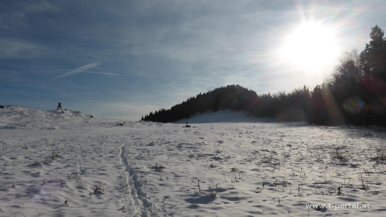 Das Wetter ist noch immer ziemlich mild, da steht einer weiteren Wandertour nichts im Wege. Laut diversen Webcams gibt es in den höheren Lagen etwas Schnee, aber die normale Ausrüstung sollte dafür noch reichen. Ich starte meine Tour in Hohenberg bei der Kirche und wandere von dort ein Stück hinauf zur Hubertuskapelle und dann weiter entlang des Stadelbergkamms aufwärts. Nach einiger Zeit treffe ich auf die ersten Schneereste, dafür scheint mich von der andere Seite die Sonne an. Ich überschreite einen namenlosen Nebengipfel und wende mich dann in die Nordseite des Hangs. In der Schräge gibt es schon mehr Schnee und ich ziehe die erste Spur hindurch. So geht es weiter bis zu einer Forststraße. Dieser folge ich einige Kurven lang, bevor es wieder in den Hang geht. Nun im Schatten deutlich tiefer durch den Schnee, bald aber wieder im Wald erreiche ich den Kreuzungspunkt zwischen Höger und Stadelberg.