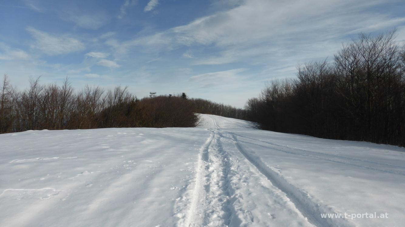 Zum Jahresanfang gehe ich immer wieder gerne auf den Schöpfl, dieses Jahr auch deutlich früher als sonst. Ich folge dem Weg von Klammhöhe immer auf und ab über den Kamm zum Gipfel. Schnee gibt es durchgehend, wenn auch nicht wirklich viel. Windig ist's heut auch, beim Aufstieg auf die Warte halte ich mich lieber gut an.