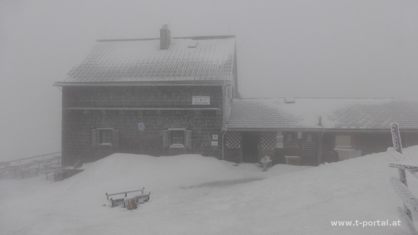 Ich pausiere und jausne im Winterraum, bevor es ca. am gleichen Weg zurück zur Hinteralm geht. Nun gut eingepackt dem Sturm entgegen bis zur Ebenwaldhöhe und von dort wieder nach Kleinzell. Im Abstieg schneit es etwas und auch im Tal ist die Straße von Schneeflankerl bedeckt. Eine gute Tour zum Schneeschuh probieren - auch wenn ich es wohl aufgrund der Schneelage auch ohne geschafft hätte. Noch etwas seltsames ist heute passiert: Ich habe trotz Wochenende keinen Menschen auf der gesamten Runde getroffen.