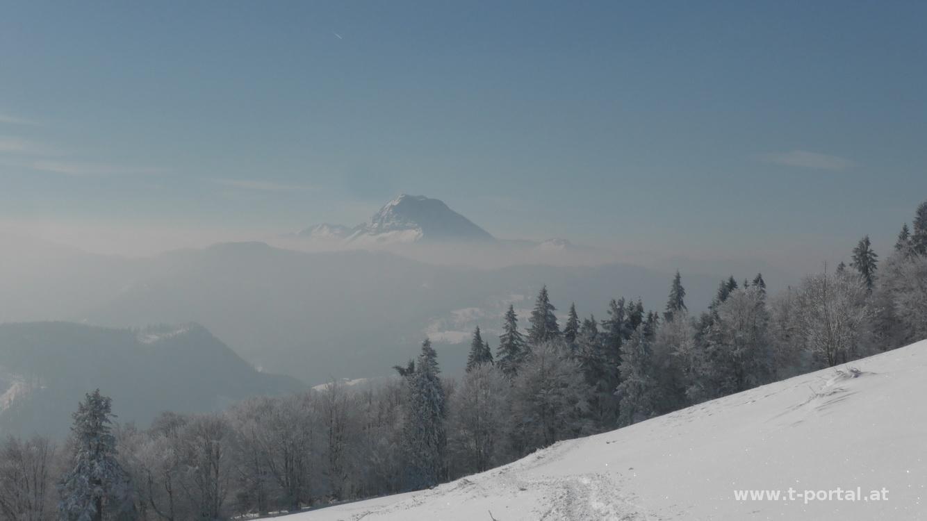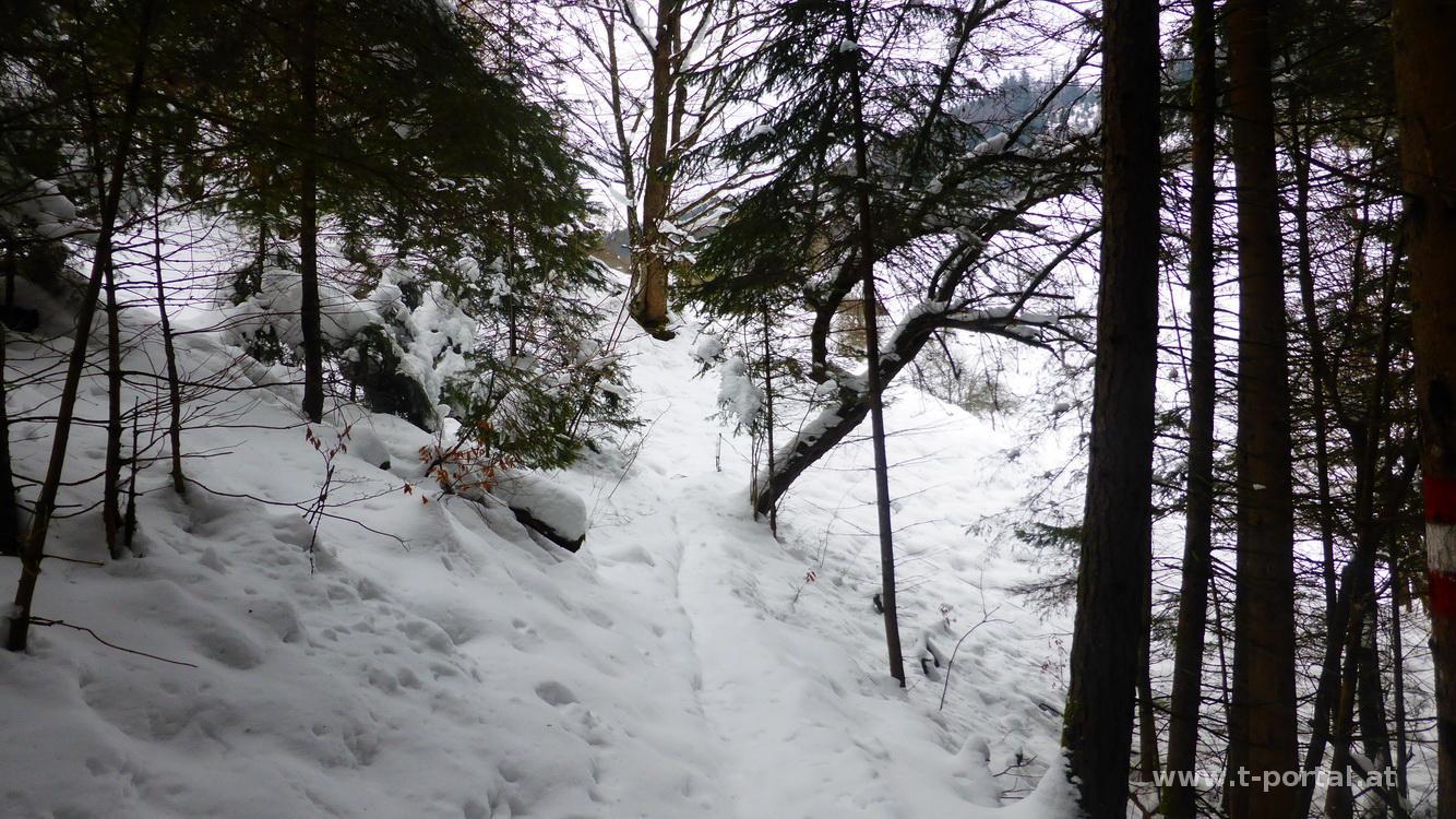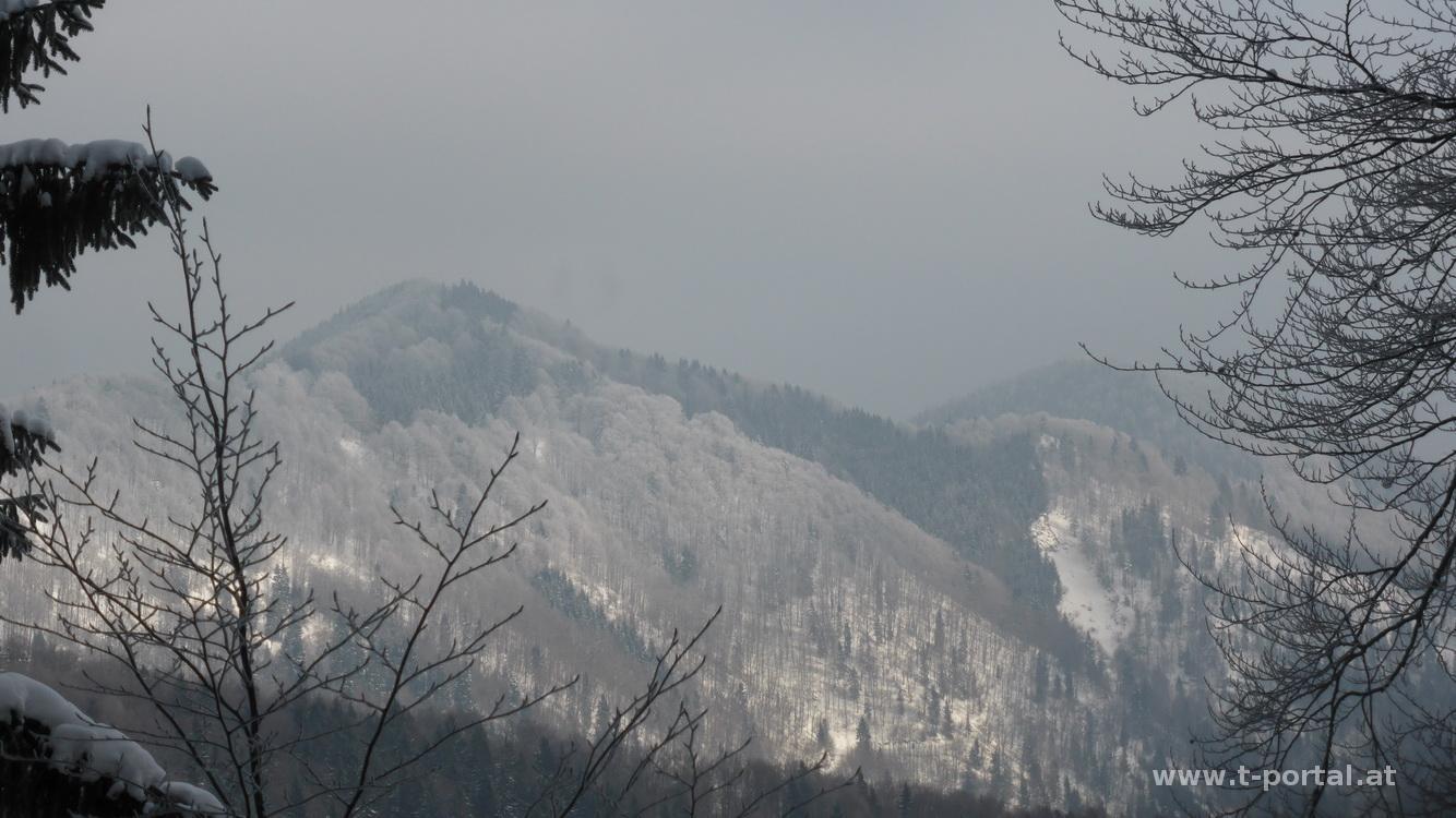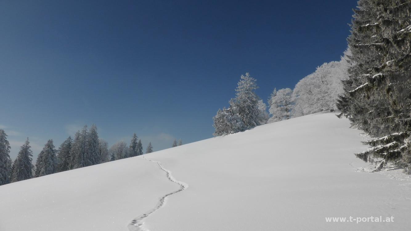 Schönes Wetter ist angesagt, da packe ich schnell meinen Kram zusammen und auf geht's nach Türnitz. Von dort wandere ich am Weg 655 Richtung Eisenstein. Zuerst ein Stück auf der Straße, geht es bald über eine Wiese und in den Wald. Die Spuren dürften schon einige Tage alt sein und so setze ich meine Schuhe in frischen Pulverschnee. Kurz vorm Hof Kalksöd wird es wirklich tief und ich schnalle mir die Schneeschuhe an. Im freien Gelände versink ich zwar trotzdem etwas, komme aber gut voran. So geht es relativ unsteil auf einem Fahrweg bis zum Hochgraser. Inzwischen bin ich auf auf den Weg aus dem Sulzbachgraben getroffen, von dem deutlich mehr Spuren hinauf führen. Es folgt eine scharfe Kehre und ein etwas steileres Stück bis ich ein paar Forstwege quere und bald den Großteil der Spuren wieder verliere. Nun geht es in schrägen Waldstücken großteils auf, manchmal auch etwas ab, bis ich auf den Weg vom Gscheid und Hohenstein treffe.
