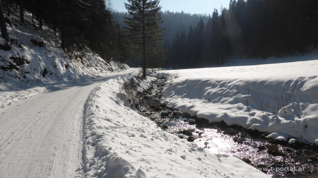 Vom Ortbauer geht es auf der Schneefahrbahn runter bis zum Knedelhof, dann wieder leicht bergan, durch einige Höfe und über Feuchten retour nach Türnitz. Beim heutigen Wetter eine traumhafte Tour, bisher hatte ich den Eisenstein eher vernachlässigt und nur im Kombination mit dem Hohenstein besucht.