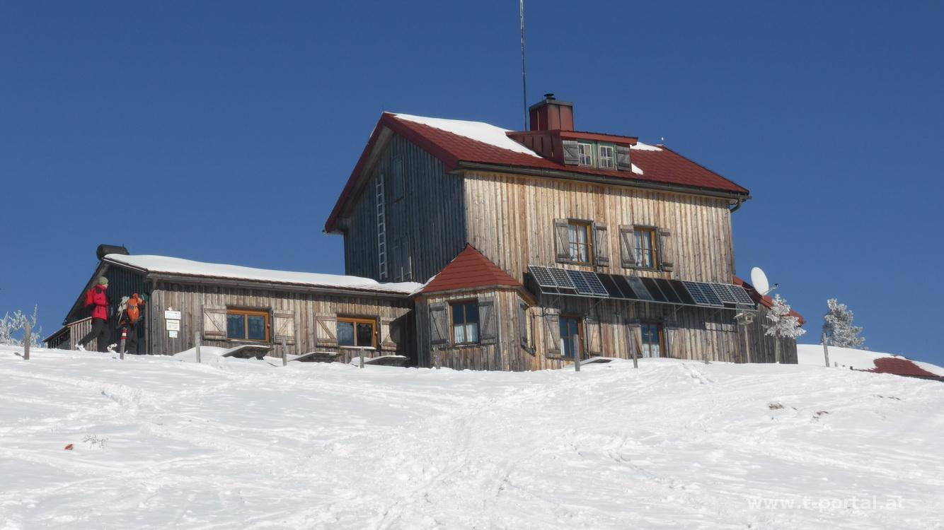Nun fehlen nicht mehr viele Höhenmeter und ich gelange auf die weiße Wiesenfläche kurz vor dem Ziel. Inzwischen scheint mir auch die Sonne auf den Kopf und ich blicke auf eine wundervolle Winterlandschaft. Ich folge den wenigen Spuren und gelange bald zur Julius Seitner Hütte vor der heute einige Tourenski im Schnee stecken. Ich gönne mir auch eine Stärkung und nach dem Gipfelfoto geht es wieder ins Tal. Der Abstieg erfolgt am Weg 622, dieser führt von der Hütte noch ein Stück weiter, um eine Kurve und dann immer in einer Waldgasse zum Ortbauerhof. Inzwischen weiß ich auch, wo die ganzen Tourengeher rauf und runterkommen. Man könnte hier auch gut mit der Rodel runterfahren, die passte aber nicht ins Gepäck :-).