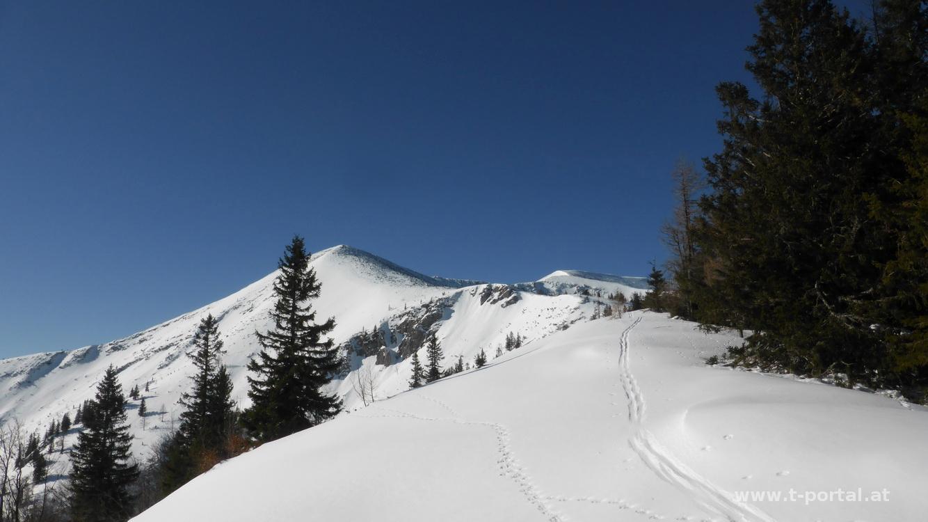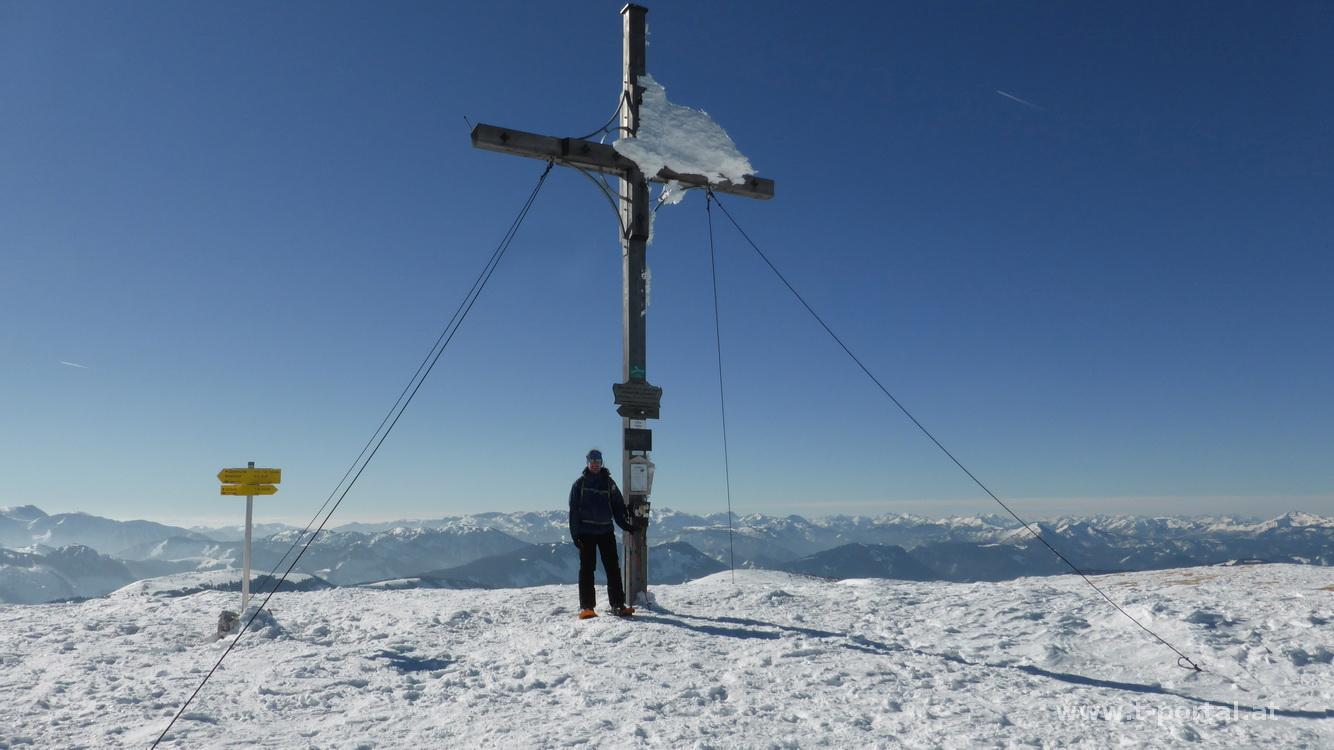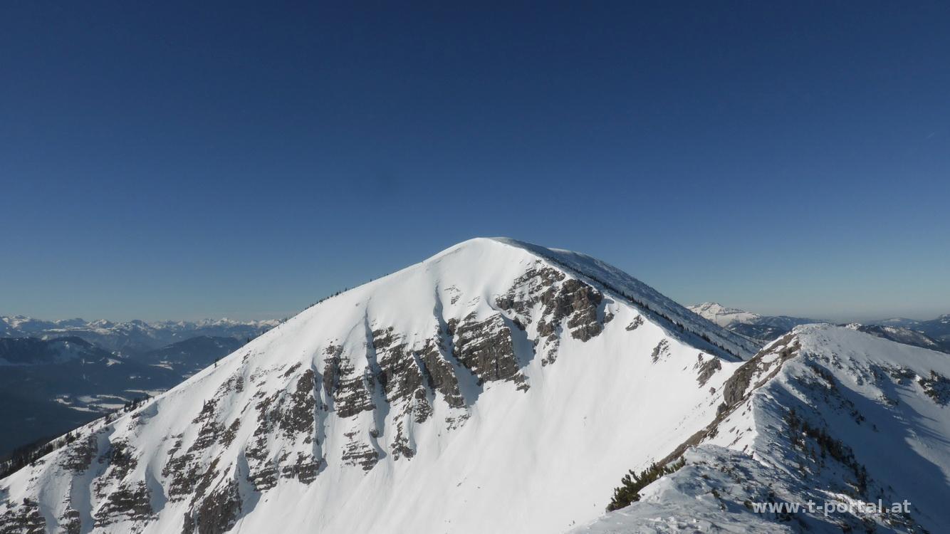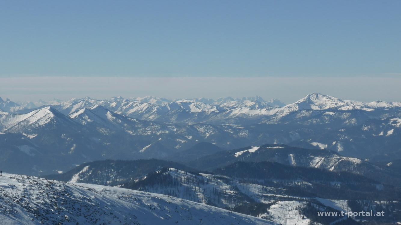 Danach geht es etwas auf und ab über die Göllerwiese, bis zum Anstieg auf den kleinen Göller. Dieser erfolgt ziemlich direkt über die verschneiten Latschen. Am Gipfel weht zwar der Wind, dafür gibt es heute super Aussicht. Nach Fotopause steige ich ab zum Kamm und es folgt der schwierigste Teil des Pfades: Über den Kammweg geht es zuerst flach dahin, nochmal etwas ab und dann steiler hinauf zum großen Göller. Nach einigen extra Kehren im Anstieg werde ich auf der Gipfelweise vom kaltem Wind empfangen, der den Großteil des Schnees schon verblasen hat. Am Gipfel rasten auch ein paar Tourengeher, die für mich ein Gipfelfoto schießen. Nach einem Haufen Panoramabildern (Blick bis zum Dachstein) geht es weiter Richtung Terzer Göller.