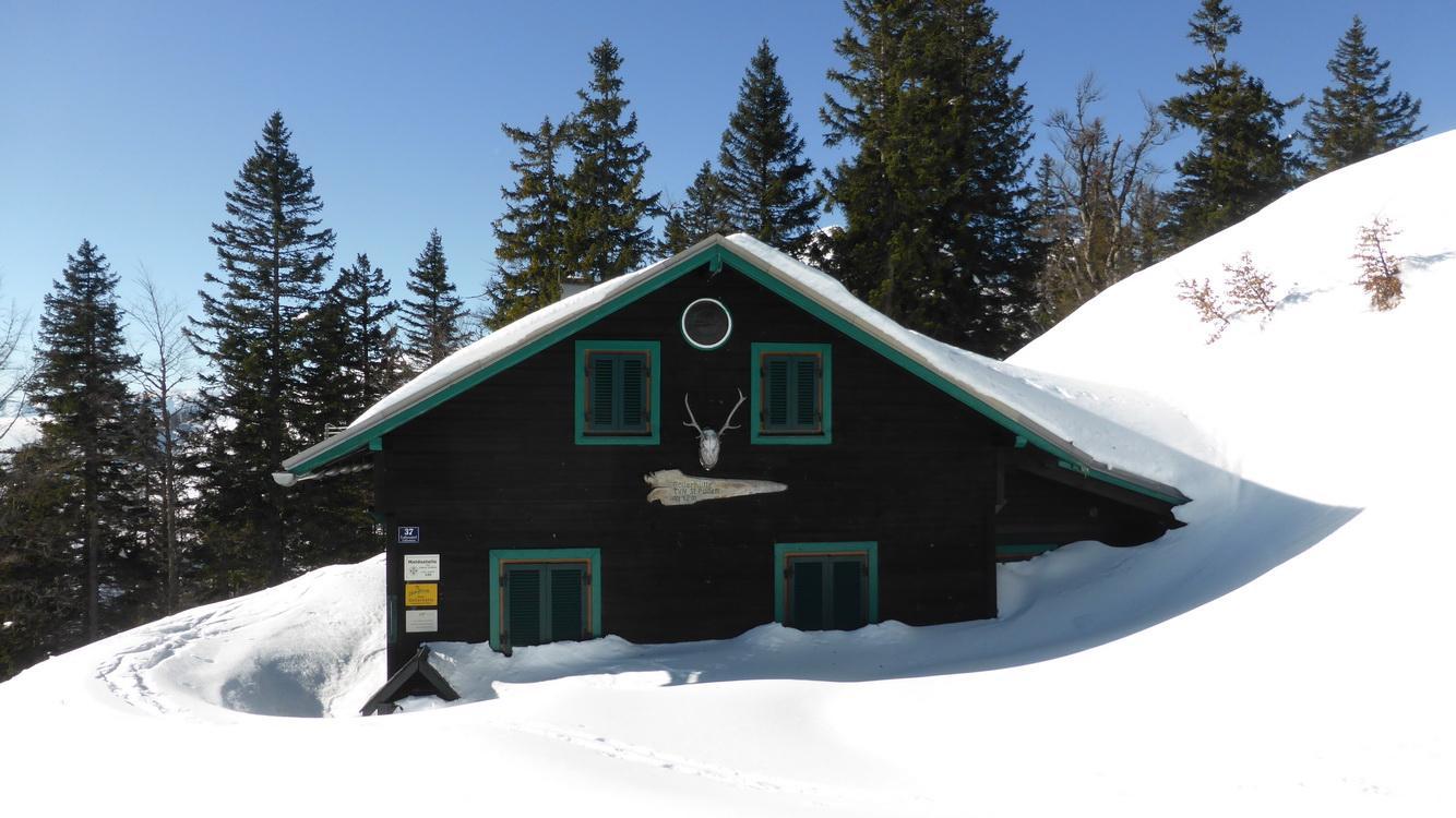 Für heute entscheide ich mich für eine Schneeschuhtour auf den Göller. Start ist beim Parkplatz nach Lahnsattel bei der Abzweigung zum Donaudörfl. Von dort an ein paar Häusern vorbei zum Winterweg auf Göller/Hofalm/etc. Am Straßenende werden auch gleich die Schneeschuhe angeschnallt und so folge ich einer bereits vorhandenen Spur entlang des Bachs. Nach den ersten flachen Metern geht es nach rechts auf eine Forststraße, auf der es gemütlich bergauf geht. Die Spur ist ganz brauchbar und ich komme gut voran. So wander ich weiter bis zum Waldhüttelsattel mit Ausblick zum Gippel. Leider endet hier die Schneeschuhspur und so stapfe ich neben der Schispur bis zur Wiese unterhalb der Göllerhütte. Nun wird es erstmal steiler und ich lege ein paar zusätzliche Kehren im Aufstieg ein. Bald erreiche die verschneite Hütte und pausiere in der Sonne.