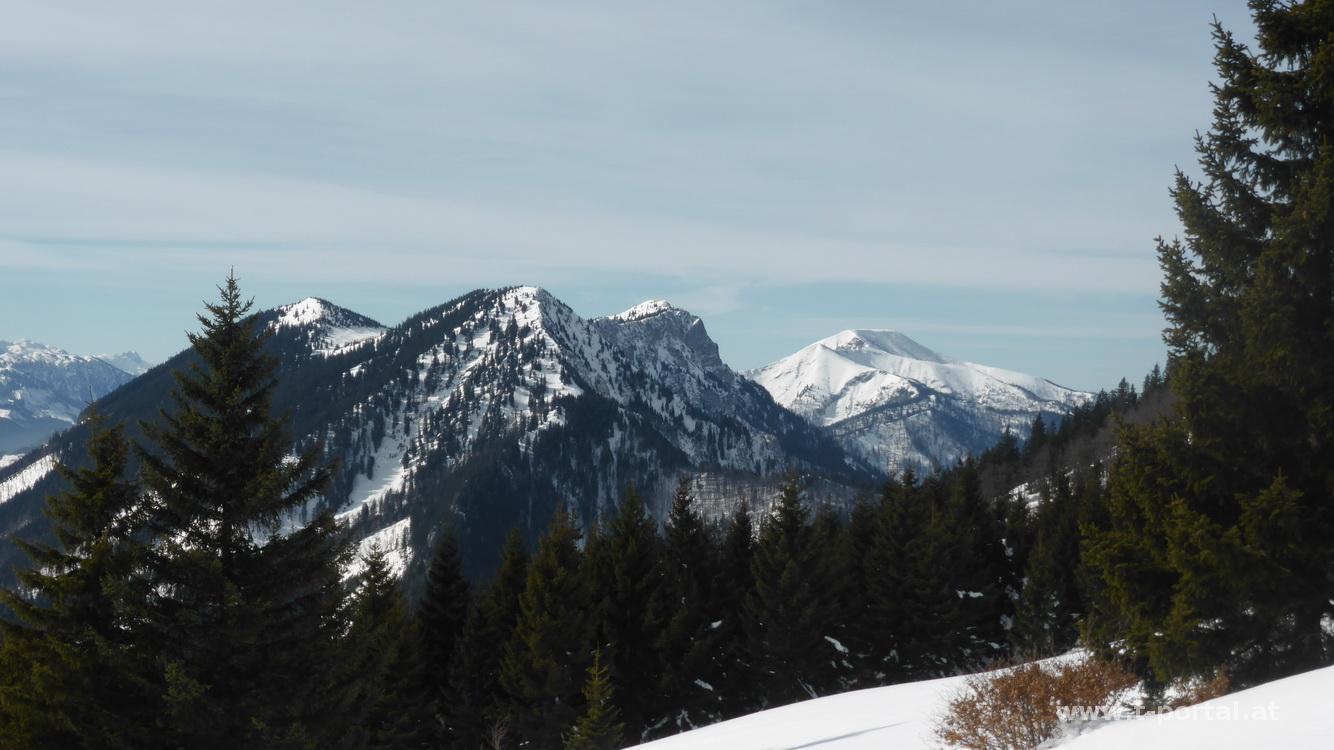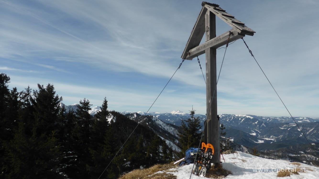 Die heutige Tour führt mich von Schwarzau im Gebirge auf den Obersberg. Ich starte im Ortszentrum, geh den Hügel rauf zur Kirche und von dort über eine Wiese bergauf. Bald schnalle ich die Schneeschuhe an und folge den vorhandenen Spuren. Mal mehr, mal weniger steil geht es durch den Wald. Im Schatten ist der Schnee heute gut zu gehen, die vorhandenen Spuren machen es auch einfacher. Bald erreiche ich sonnigere Passagen an denen der Schnee schon dahinschmilzt. Zwischendurch quere ich ein paar mal Forststraßen und je höher ich hinaus komme, umso besser wird der Blick zu Schneeberg, Rax und co. Das steilere Stück nehme ich am harten Schnee neben der vorhandenen Spur in Angriff, da diese durch Fußpuren in Mitleidenschaft gezogen ist. Dann ist es nur noch ein kurzes Stück bis zur Waldfreundehütte und weiter zum Gipfelkreuz.