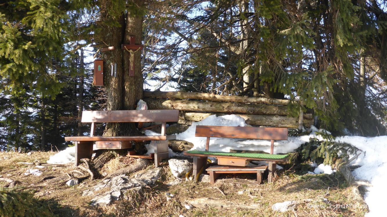 Die Jochart habe ich bisher ausgelassen, irgendwie war mir das als Einzeltour im Sommer zuwenig. Aber im Winter nach zwei Touren in Folge passt das ganz gut. Start ist in Rohr im Gebirge in der Nähe des Gemeindeamts. Von dort ein Stück durchs Dorf, vorbei an einem Bauernhof und bis zum Ende einer Asphaltstraße. Nun entlang eines Forstwegs über etwas Schnee bergauf. Die Schneeschuhe sind wieder dabei, bleiben aber vorerst am Rucksack. Der Weg führt vorbei an einer großen Gedenkstätte bis ich irgendwann die Straße verlasse. Nach etwas flacherem Teilstück geht es im Wald steiler hinauf. Noch immer gibt es Fußspuren, denen ich nachstapfe. Zwischendurch setze ich mich etwas in die Sonne, bevor ich eine Wiese erreiche. Damit sich die Schneeschuhe doch noch auszahlen, kommen sie jetzt an die Füße und die Frontzacken freuen sich über den ziemlich direkten Anstieg bis zum Gipfelkreuz. Dieses steht etwas unterhalb des Gipfels, also geht es nach links zum Gipfelbankerl mit Schnaps und Sitzkissen.