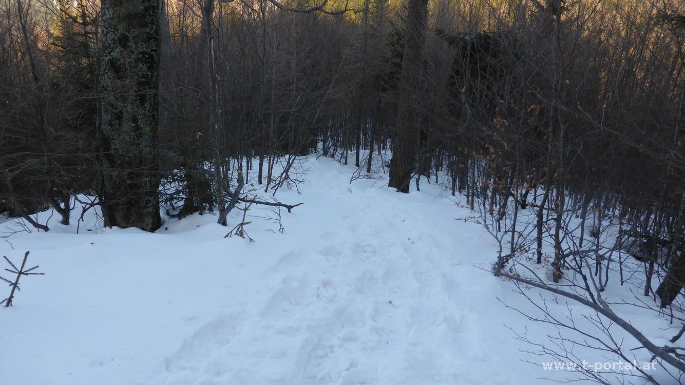 Der Ausblick ist heut deutlich trüber als die letzten beiden Tage, trotzdem bleibe ich länger in der Sonne sitzen. Danach geht es am Kamm weiter bis zum Hammerleck. Von hier lässt es sich am Wanderweg durch tiefen Schnee gut hinab gleiten. Irgendwann erreiche die Forststraße, die bis zur Bundesstraße hinab führt. Auf der Bundesstraße und durchs Dorf geht es zurück zum Start.