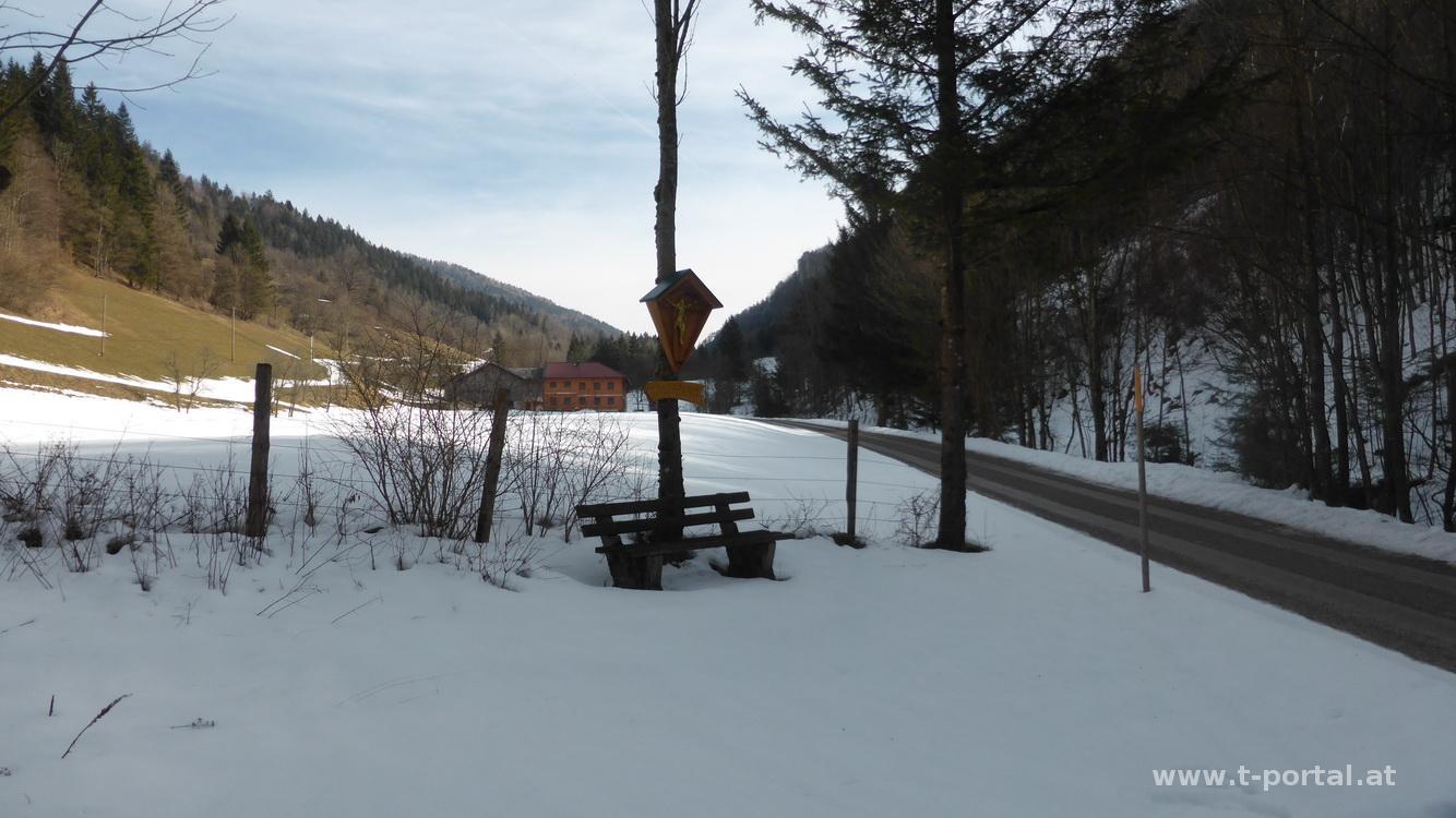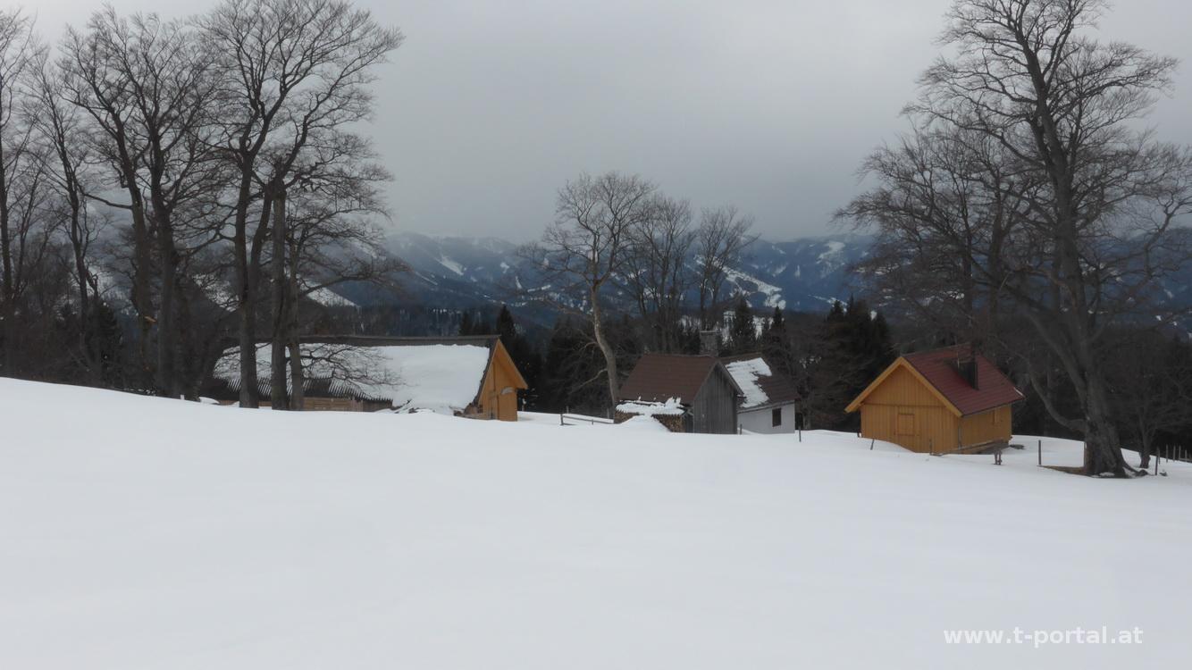Bei schlechten Wetterprognosen nehme ich die Traisner Hinteralm auf neuem Weg in Angriff. Start beim Hof Thaler in Innerfahrafeld. Anfangs geht es über Forststraßen, die ich ein paar Mal über Wald und Wiesen abkürze. Schnee gibt es hier nur auf flachen, schattigen Stücken. So komme ich bis zur Talerhütte, wo ich dann doch die Schneeschuhe anschnalle. Auch die Sonne ist inzwischen verschwunden und ich wandere im Grau neben den Spuren der Schitourengeher. Weiter geht es bis zum Weg, den ich normalerweise bei den Reisalpen-Muckenkogel Touren begehe. Im einsetzenden Schneegestöber bewältige ich die letzte Steigung zur Traisnerhütte, in der ich erst mal raste und trockne.