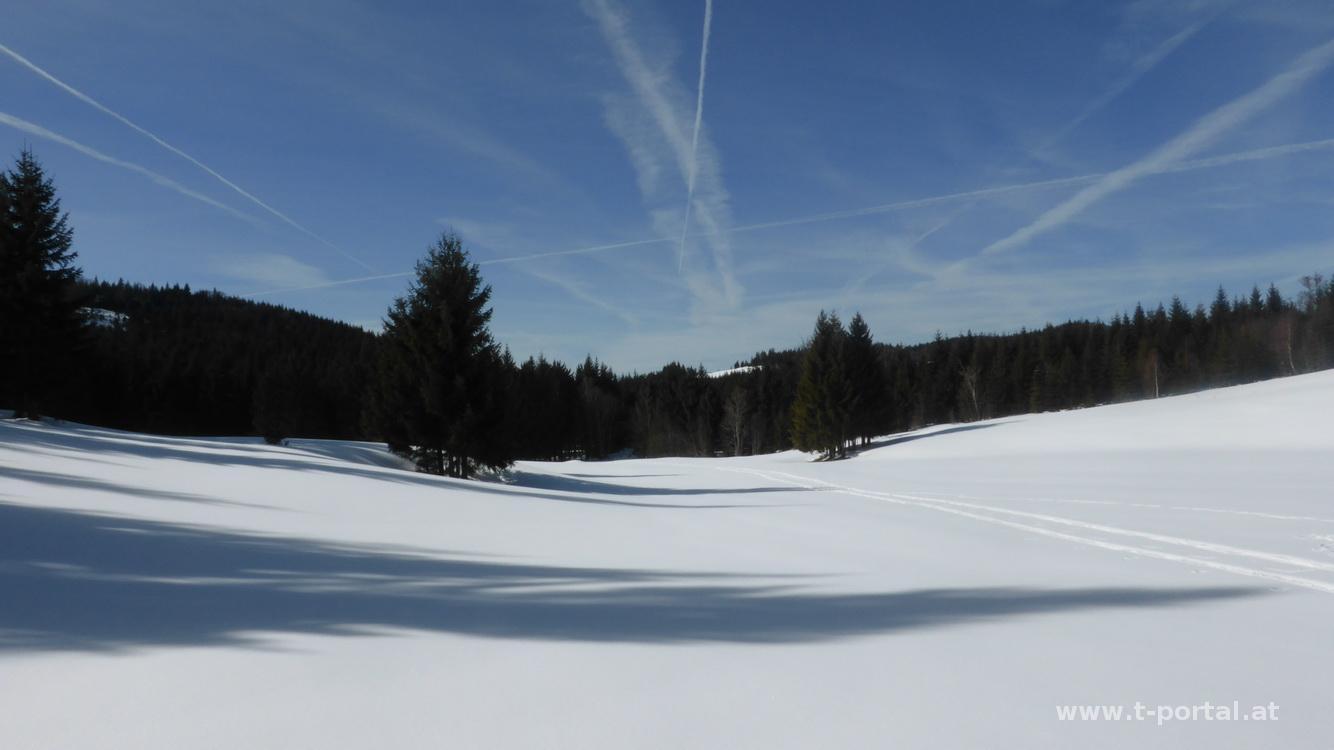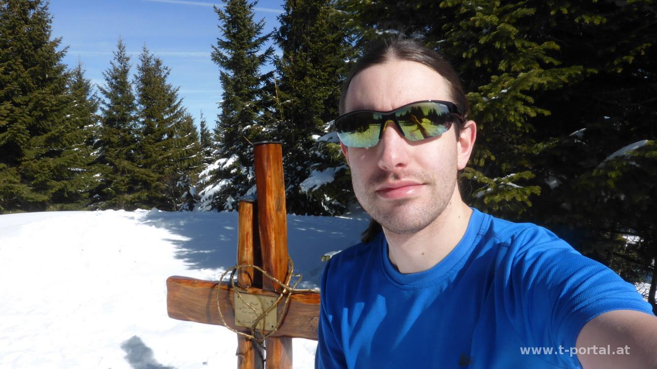 Bei wunderbarem Wanderwetter verschlägst es mich heute nach Schwarzenbach an der Pielach. Hier parke ich mein Auto beim Hof Kowald und wandere dann entlang von Forststraßen bergan. Die Schneeschuhe sind, nach der gestrigen Pause, heute wieder dabei, bleiben aber vorerst am Rucksack. Im Sonnenschein geht es entlang zahlreicher Fußspuren bis zur Hölzernen Kirche, die ich auch letztes Jahr schon besucht habe. Nun etwas steiler über einen Forstweg bergauf, bis ich wieder auf eine Wiese komme. Nun ist es nicht mehr weit bis zum Abzweiger zum Hennesteck, kurz vorm Weißen Kreuz (das ich heute auslasse). Nun kommen auch die Schneeschuhe an die Füße und es geht am Sommerweg steiler bergauf. Spuren gibt es zur Genüge und ich muss mir noch keine Gedanken über die Wegfindung machen. Auch das Hennesteck nehme ich heute ohne Umweg im Kauf und erreiche nach knapp zwei Stunden den Gipfel. Vom Gipfelkreuz ist heute nur wenig zu sehen, dafür schaut zwischen den Bäumen der Ötscher hervor.