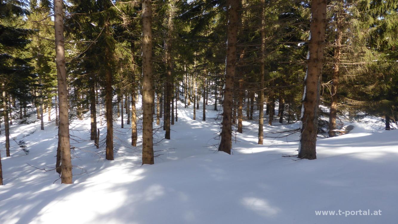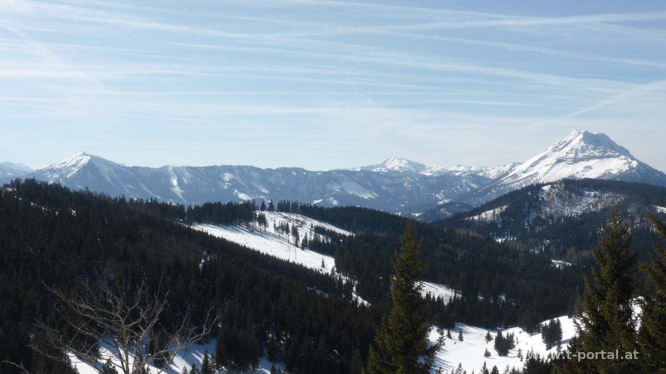 Nach ausgedehnter Rast in der Sonne geht es hinab Richtung Schigebiet. Vorbei an der Talstation eines Lifts folge ich den Spuren einiger Tourengeher auf und ab. In der Sonne geht das gut, im Schatten versinke ich tiefer im Schnee. Nach einem kurzen Anstieg biege ich nach einem Hochstand leicht rechts ab und gehe zuerst durch Wald und dann steiler am Rand eines Hangs hinauf. Ab hier gibt es lange keine Spuren mehr und ohne GPS wäre ich wohl etwas planlos. Nach dem Anstieg wird es etwas flacher und ich habe tollen Ausblick rüber zu Ötscher und Umland. Nach einem weiteren Anstieg vorbei am Futterkogel und Blick zurück zu den letzten Zielen, geht es auch schon wieder quer durch den Wald hinunter. Auch für den nächsten Anstieg suche ich nicht lange nach einem Forstweg sonder schlage mich durchs Geäst bis zum Mitterkeil.