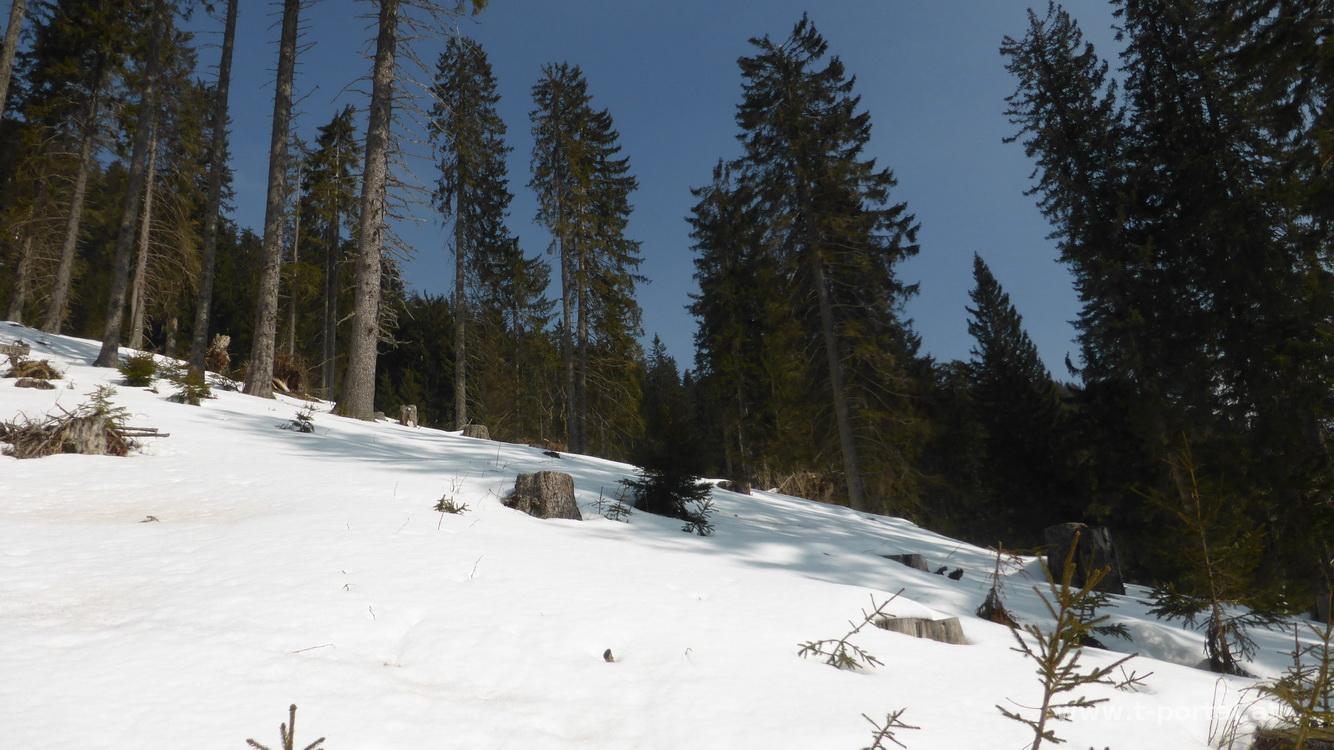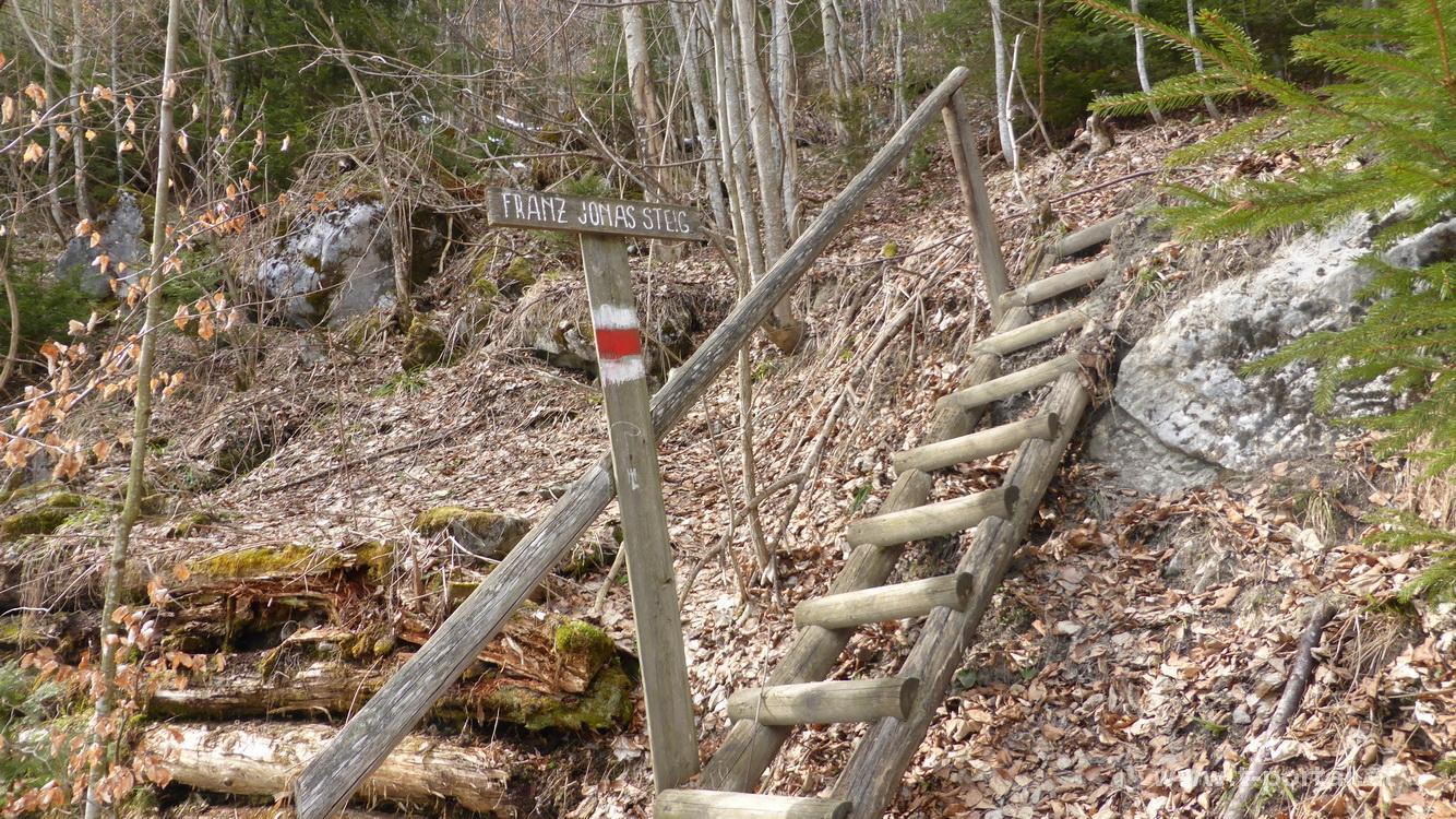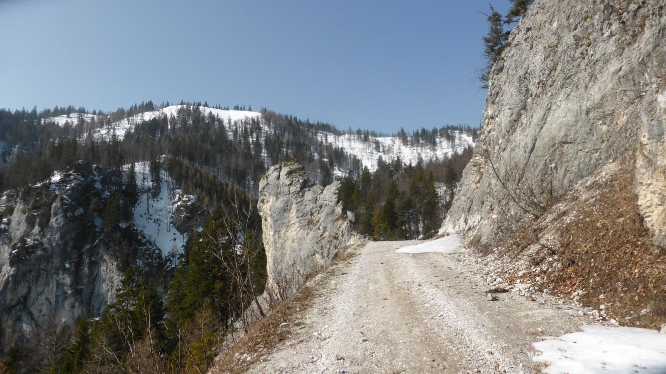 Weiter geht auf der Straße, bis ich im Graben einige Markierungen des Franz-Jonas Steiges sehe. Also nochmal ziemlich direkt hinab und bald treffe ich auf den Steig. Diesen weiter bergab, bis der Schnee irgendwann weniger wird. So geht es über teilweise schlammigen Waldboden ins Tal. Das letzte Stück am bekannten Weg retour. Meine Routenwahl war heute eher nicht optimal - bei soviel Schnee wäre es im Anstieg besser gewesen, die letzte Forststraße nicht zu queren, sondern auf ihr bis unterhalb des Gipfels zu wandern. Danach wäre es relativ steil Richtung Gipfel rauf gegangen. So bin ich heute häufig bis über die Knie, ein paar Mal auch bis über die Hüfte versunken. Trotzdem eine schöne und einsame Tour und ein neuer Gipfel in der Sammlung.