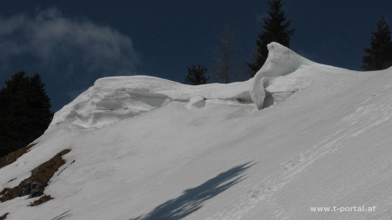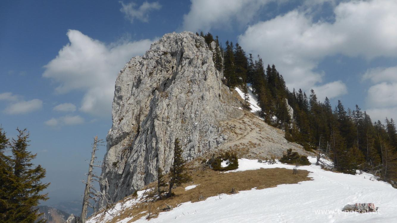 Danach geht es über die Alm weiter wieder in den Wald, bis ich eine Forststraße quere. Nachdem ich im Schnee immer wieder bis übers Knie versinke, probiere ich es dann doch mit den Schneeschuhen, dies geht aber nur kurz gut. Bald erreiche ich den langen Querhang Richtung Gipfel, in dieser Schräglage stapfe ich lieber wieder so weiter. Langsam aber doch komme ich zum letzten Wegweiser vor dem Gipfel. Nun geht es rauf auf den Kamm, rund um den Gipfelfelsen und nochmal durch einen Haufen Schnee zum Gipfelkreuz. Heute ist es zwar etwas trüb, aber die bekannten Berge in der näheren Umgebung sind im Blickfeld. Nach ordentlicher Pause geht es runter bis zur letzten Abzweigung. Nun folge ich nicht mehr dem Wanderweg, sonder rutsche direkt durch den Wald bis zur nächsten Forststraße ab.