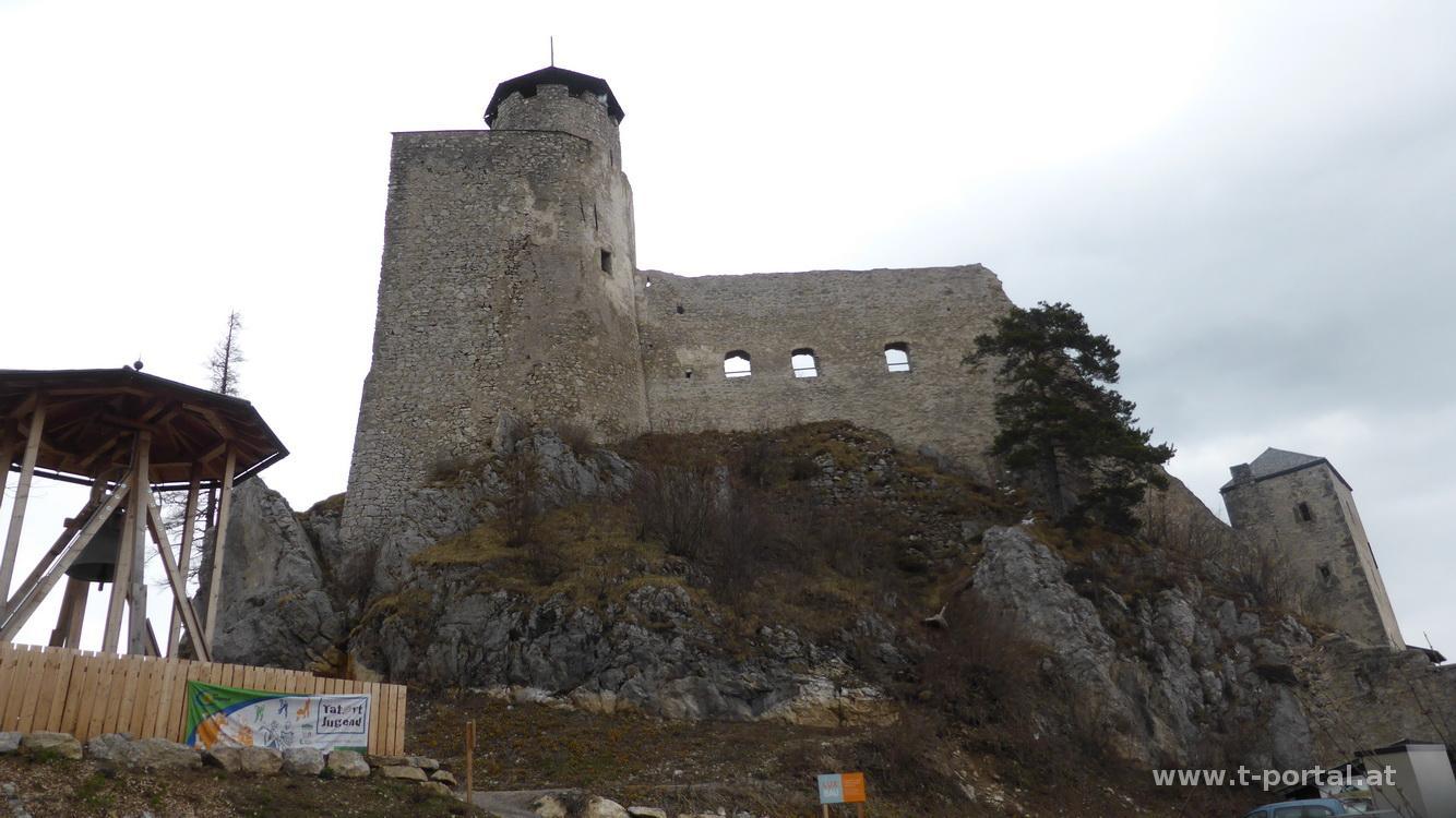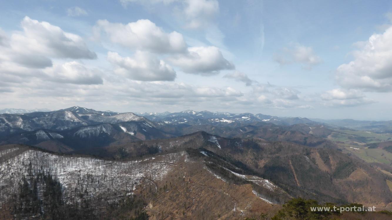 Nach ausgedehnter Sonnenpause geht es zuerst am gleichen Weg zurück und dann im etwas rutschigen Schnee abwärts. Am weiteren Weg liegt durch die Sturmschäden der letzten Monate viel Holz herum und ich kraxel ein paar Mal unter und über große Stämme. So gelange ich bis zum roten Kreuz, von dem man wieder zu den Teichen runter gehen könnte. Für mich folgen einige An- und Abstiege am weiteren Weg. Ich umrunde ich den Hochriegel und gehe weiter zum Veiglkogel. Wie vermutet wird die Sonne langsam weniger, aber es bleibt angenehmes Wanderwetter. Zwischendurch hab ich immer wieder Ausblick zum Unterberg, Reisalpe & co. und irgendwann rückt auch die Araburg in Sichtweite. Das letzte Stück geht es auf einer Forststraße vorbei am Kölchberg bis zur Burgruine. Ich besuche den höchsten Punkt im Turm und blicke zurück zum Hocheck und den Kamm dazwischen.
