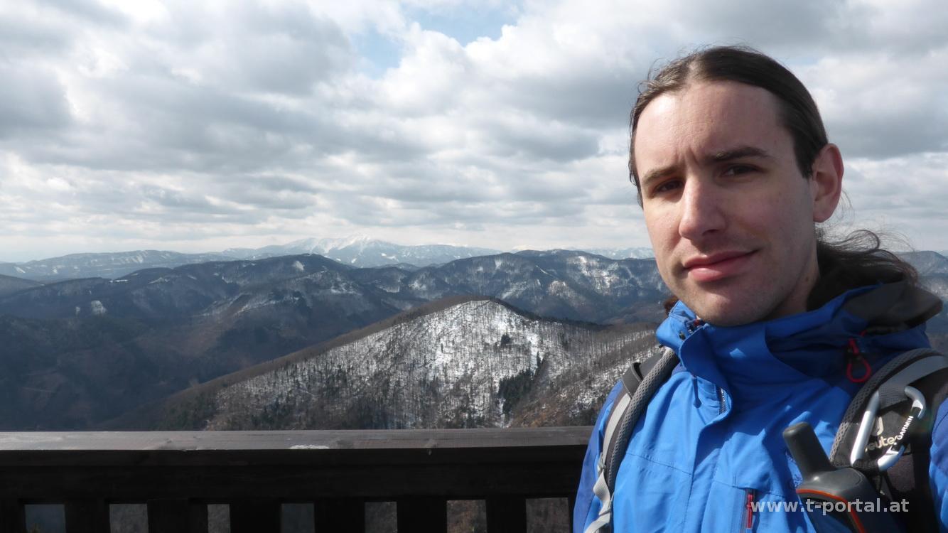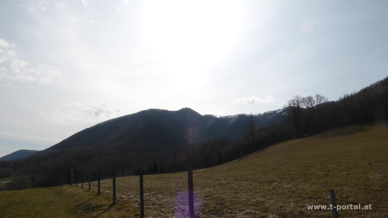Heute steht eine schöne Frühjahreswanderung am Programm. Von Kaumberg geht es aufs Hocheck und von dort über eine lange Kammwanderung zur Araburg. Samstag vormittags stelle ich mein Fahrzeug etwas abseits des Hauptplatzes beim Kindergarten ab, quere dort den Bach und folge gleich der Markierung aufwärts. Vorbei geht es zuerst am Schilift von Kaumberg zu einem Aussichtplatz mit dem ersten roten Kreuz. Über Feld und Forstwege geht es auf und ab und vorbei an einigen Höfen, bis ich zum Parkplatz beim Fischteich komme. Von hier bin ich vor einigen Jahren zum ersten Mal aufs Hocheck gestartet. Nun geht es ab in den Wald und bald steiler in Serpentinen bergauf. Ich quere eine Forststraße und treffen dann auf etwas Schnee. So komme ich bis zur Kreuzung zum Kammweg, auf dem ich später weitergehen werde. Ein paar Minuten später steh ich auch schon auf der Meyringer Warte und Blicke bei Sonnenschein in die Gegend. In einiger Entfernung ist die Araburg und viel Weg dazwischen sichtbar.