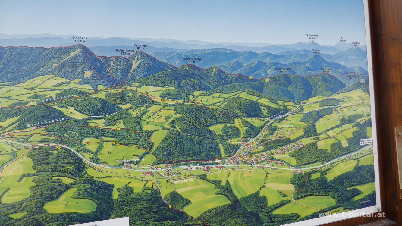 Nach einer Mehlspeise im Burgstüberl geht es vorbei am Mayerhof zurück nach Kaumberg, wo ich am Hauptplatz noch eine Übersichtstafel mit den ganzen Hügeln finde. Nach dem Aprilwetter der letzten Tage hätte ich nicht damit gerechnet auf der heutigen Runde so tolles Wanderwetter zu haben. Insgesamt eine wirklich schöne Runde, das auf und ab hängt sich natürlich rein - für den Kammweg wären vier Stunden angeschrieben.