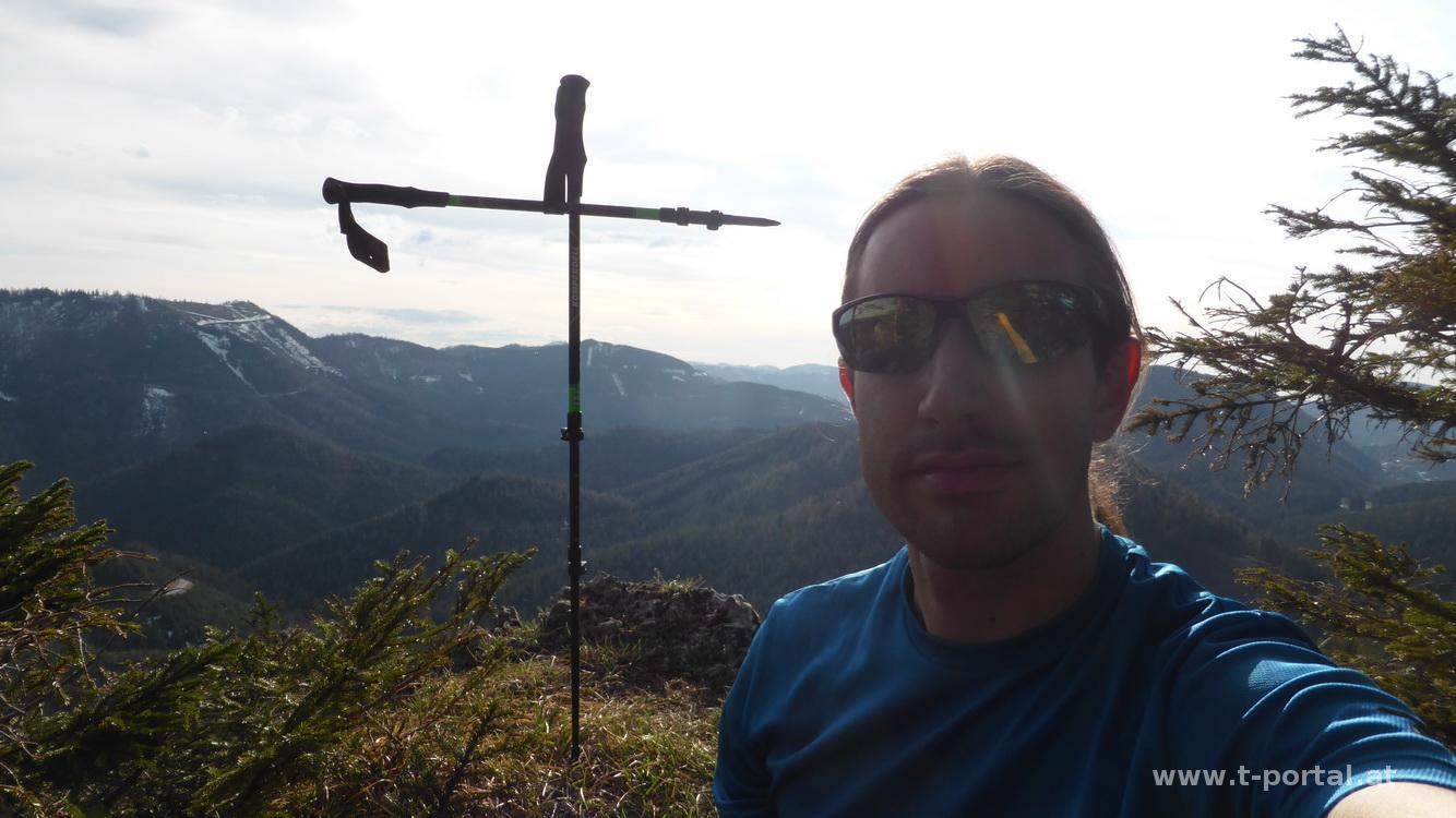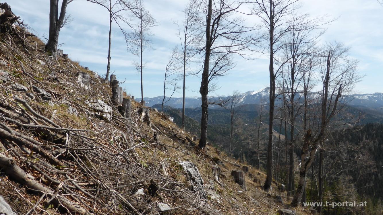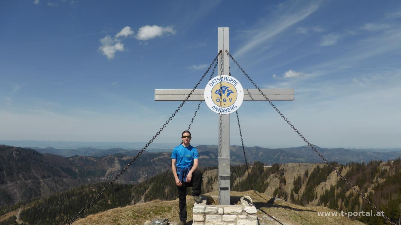 Als ich das erste Mal am Tirolerkogel war, bin ich durchs Dachsental rauf und durch die Falkenschlucht wieder retour gegangen. Das hat mir gut gefallen, nur der Forststraßenhatscher vom/zum Eisernen Tor war ziemlich langweilig. Andererseits wollte ich schon länger von Annaberg auf den Tirolerkogel gehen. Darum habe ich diese beiden Routen zu einer etwas kreativen Route zusammengebaut. Ich starte also in Annaberg und folge der Forstautobahn bis zum Kreuz und Bankerl am Gscheid. Ich wende mich nach links und folge einigen Steigspuren bergauf auf mein erstes Ziel: Den Ahornberg. Nach einem flacheren Stück durch den Wald steige ich ziemlich steil und direkt, zuerst am Waldesrand und dann über Stein und Geäst, hinauf. Im Rückblick wird der Ausblick vom Schneeberg bis zum Ötscher immer besser. Nach dem steilen Anstieg quere ich eine Forststraße und gelange flacher über einige Schneereste bis zum Gipfel.