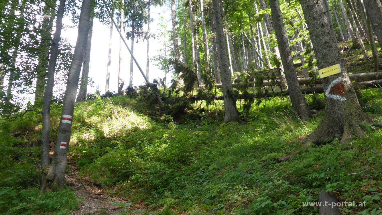 Heute verschwinde ich bereits Mittags aus dem Büro und mache mich auf den Weg nach Raneck, wo ich um 15 Uhr losmarschiere. Hier ist es etwas weniger heiß als in der Stadt und so geht es auf der Forststraße etwas auf und ab Richtung Bärenlacken. Ich hab schon ein paar Mal von einem Abschneider zum Waldweg gelesen, heute passe ich genauer auf und biege kurz vor Bärenlacken bei einem Steinmännchen auf den ausgetretenen Weg ab. So spar ich mir ein paar Höhen- und Längenmeter und komme bald auf den Normalweg. Nun durch den Wald mit einigem hin und her bergauf, durchwegs auch steiler bis es an der östlichen Hangseite bis zum Kamm geht, wo man erstmals den Blick zur anderen Seite und den Rauhen Kamm hat. Nach kurzem weiterem Anstieg ist der Einstieg zur leichten Kletterei erreicht.
