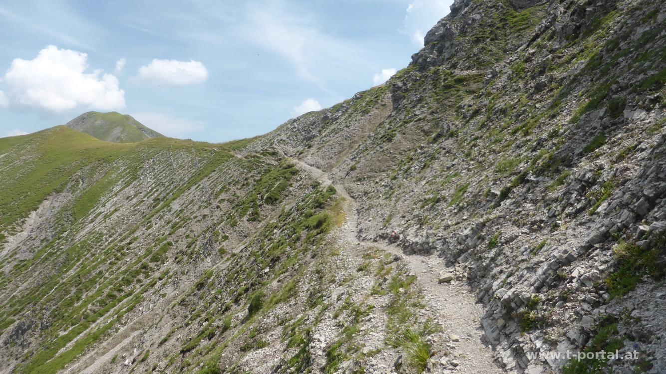 Vorher gibt es aber einmal Pause und Jause am Gipfel. Danach wieder runter und ein kurzer Abstecher auf den Almspitz. Dann auf steinigem Weg etwas runter und rauf, vorbei an einem Steinkreis und zum Gipfelkreuz der Eckwand. Nach weiterem Ausblick zu Schafen und Gipfeln geht es zuerst ein Stück retour und dann rund im Süden um den Almspitz herum. Der Weg hier ist nicht markiert und eher schmal, nebenan geht es auch gut hinunter. Irgendwann erreiche ich dann wieder die Stosia Alm von der es zuerst eher flach retour geht. Zwischendurch les' ich die Fahrzeiten der Weißenseeschifffahrt nach und stelle fest, das ich mich sputen sollte, wenn ich nicht zwei Stunden warten oder zu Fuß zurück gehen will.