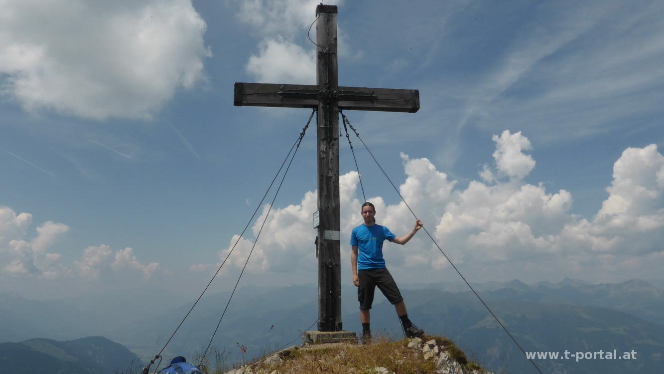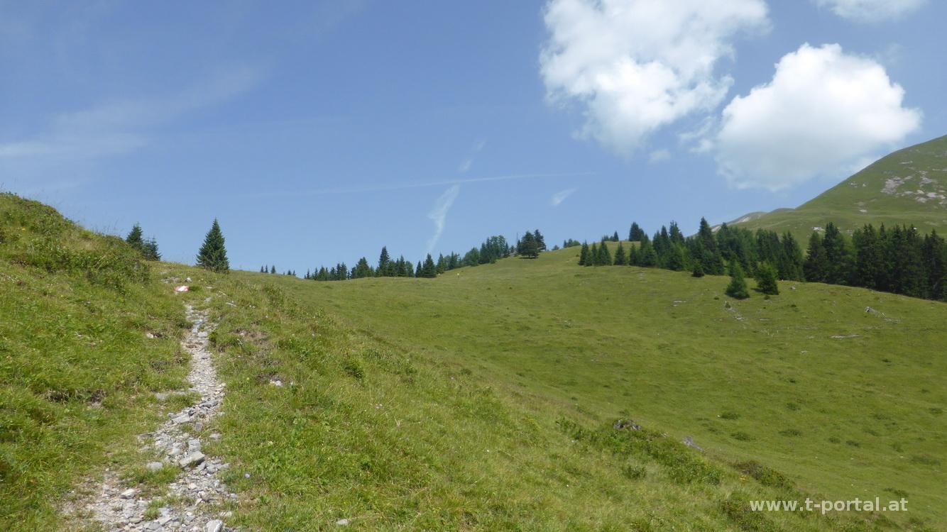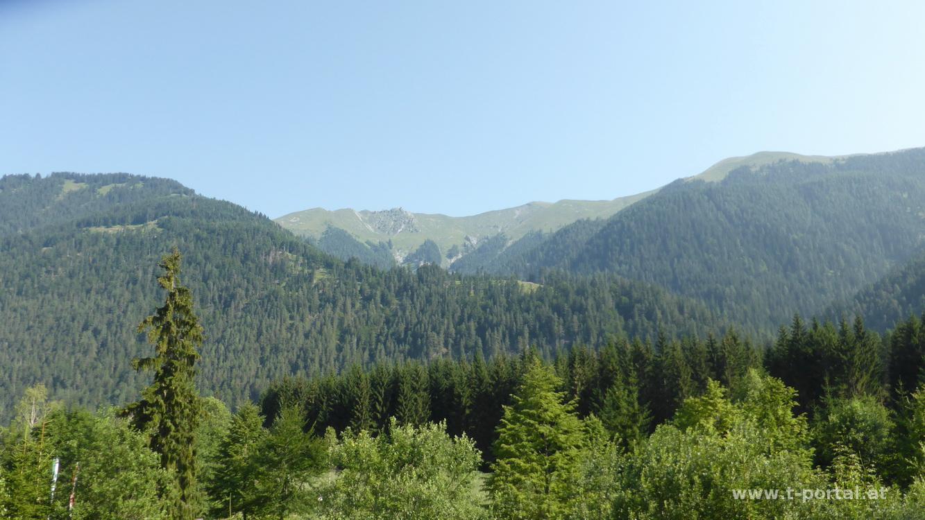 Für heute entschließe ich mich ans Ostufer des Weißensees zu fahren und von dort den Latschur zu erwandern. Nach interessanter Anreise gibt es einen großen Parkplatz und einen Weg entlang des Ostufers, vorbei an Badenden und Campern. Nach einem Stück auf der Forststraße ab auf einen Waldweg und mittelmäßig bergauf. Abwechselnd im Schatten und der Sonne geht es immer höher hinauf. Auch heute ist es warm und so raste ich das ein oder andere Mal. Nach mehrmaliger Kreuzung der Forststraße wähle ich direkten Weg zur Stosia Alm, alternativ könnte man hier zur Techendorferalm wandern und von dort weiter aufsteigen. Noch ein Stück geht es bergauf und dann steh ich auch schon neben den Kühen auf der Stosia Alm. Hier habe ich erstmals Ausblick zum Gipfelziel des Tages, dieses versteckt sich nämlich hinter dem Almspitz. Nachdem ich noch ein wenig Rast im Schatten gefunden habe, folgt der letzte Anstieg auf der westlichen Hangseite des Almspitz. Wie auch in den letzten Tagen habe ich auch hier wieder eine schwarze Markierung gefunden, die wachsen wohl hier irgendwo :-). Vorbei an einigen Schafen erfolgt der letzte Aufschwung zum Gipfelkreuz mit schönem Ausblick zum Goldeck mit Sender, der Ankogelgruppe und vielen anderen Bergen. Unweit meines Standorts seh' ich auch ein weiteres Gipfelkreuz auf der Eckwand und entschließe mich dort noch rüber zu wandern.