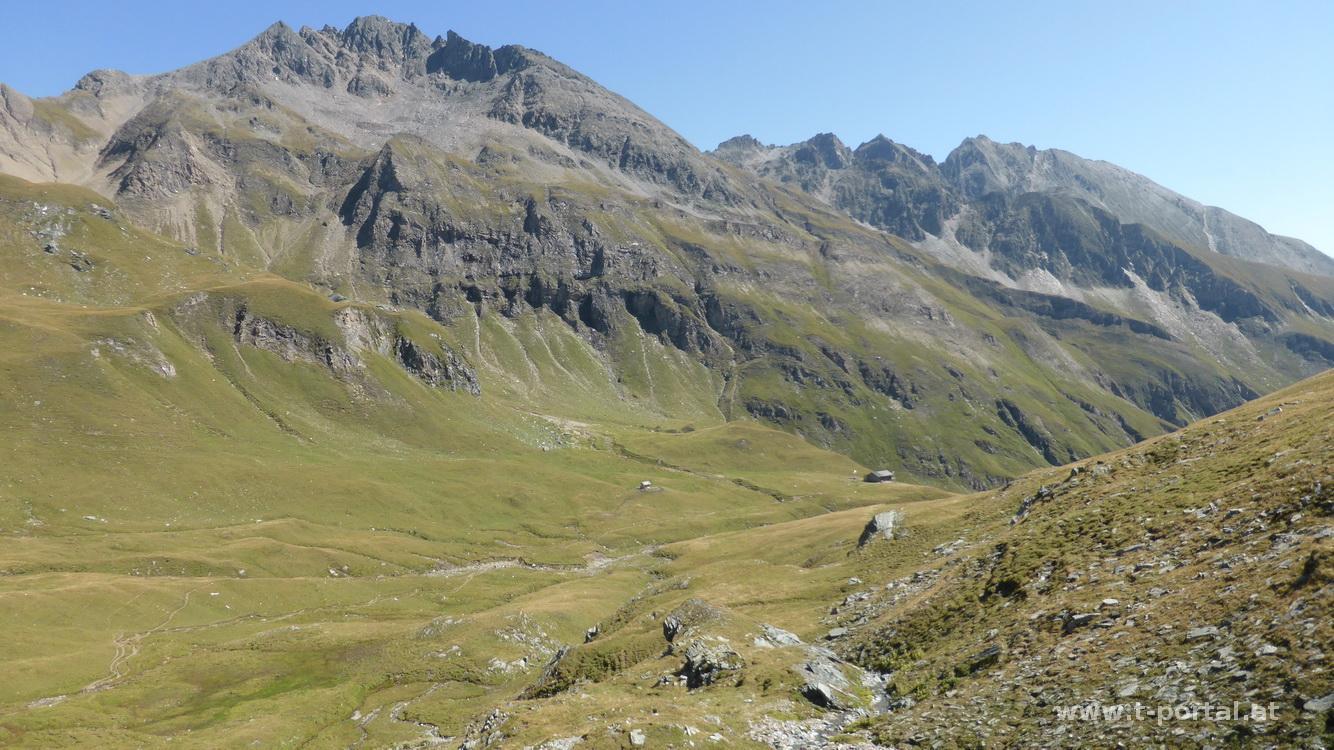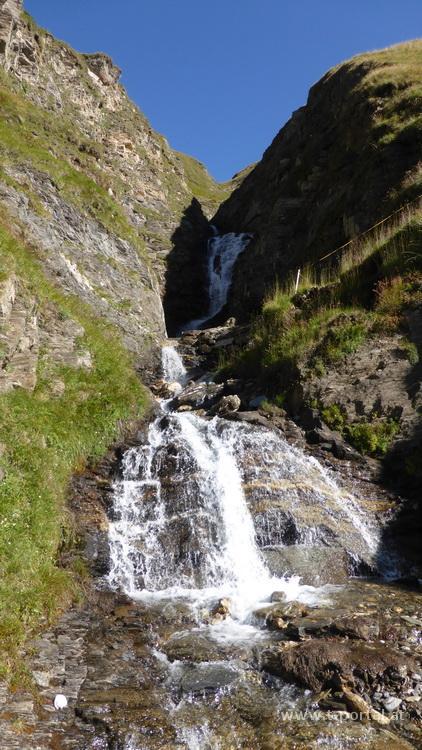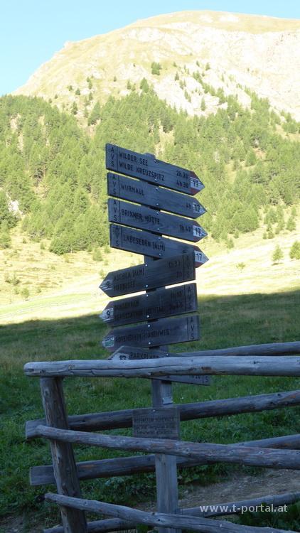 Für diesen Urlaub entschließe ich mich ein paar Tage nach Südtirol zu fahren. Als erste Tour hab ich mir meinen ersten Dreitausender ausgesucht – die Wilde Kreuzspitze, dem höchsten Punkt in den Pfunderer Bergen. Mein Tour starte ich am gut besuchten Parkplatz kurz vor der Fanealm, den ich nach einer Auffahrt von Vals über eine steile und schmale Bergstraße erreicht habe. Von dort geht es über ein Forststraße gemütlich dahin und nach der ersten Kurve ist auch schon die Fanealm in Sicht. Vorbei an den zahlreichen Almhäusern nun wechselnd in Sonne und Schatten bergauf. Der Weg führt vorbei an kleinen Wasserfällen entlang des Valler Bachs. Bei der Kreuzung mit Wegweisern zur Brixner Hütte wende ich mich nach links, diese werde ich erst im Abstieg erreichen. Weiter geht es hinauf bis zur Labisebenalm, wo aus der Forststraße ein Wanderpfad wird. Obwohl ich heute etwas höher als sonst unterwegs bin, heizt auch hier die Sonne gut ein.