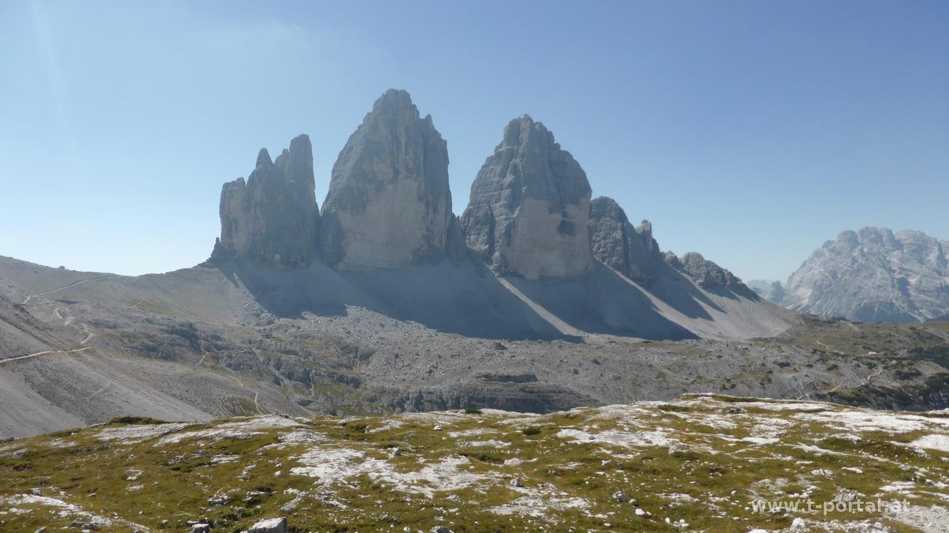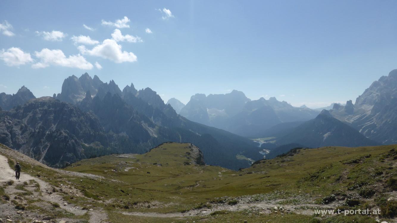 Nachdem ich den tollen Ausblick auf die drei Großen und die umliegenden Felswänden genossen habe, geht es auf breiterem Weg gut zweihundert Meter hinab und auf der anderen Seite wieder aufwärts zur Langalm. Hier finden sich auch ein paar kleine Bergseen an denen ich raste und zwei Seilschaften beobachte, die an der Nordwand der großen Zinne hochklettern. Die weitere Umrundung führt mich zum Sattel „Forcola Col di Mezzo“. Von dort auf der anderen Seite der Zinnen bis zum großen Parkplatz bei der Auronzohütte. Danach weiter bis zum Rifugio Lavaredo, wo ich nochmal pausiere und weiteren Kletterern zusehe. Danach zum Höchsten Punkt des Tages am Paternsattel. Für den Rückweg zur Dreizinnenhütte wähle ich nicht den breiten Weg sondern gehe leicht steigartig oberhalb mit etwas auf und ab retour. Zurück ins Tal geht es dann am Anstiegsweg.