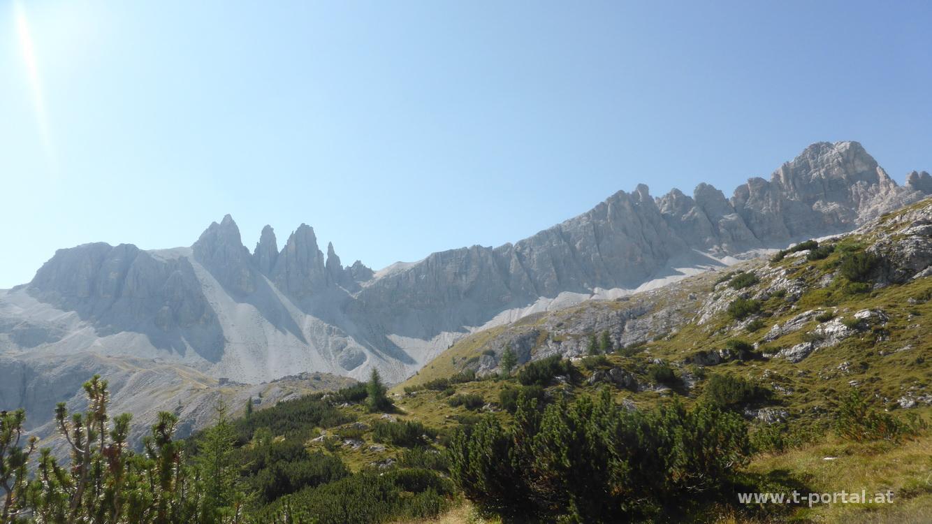 Nachdem ich gestern Richtung Dolomiten geblickt habe, wollte ich mir diese heute aus der Nähe ansehen und entschließe ich für mich eine Umrundung der drei Zinnen aus dem Fischleintal aus. Dort gibt es einen großen Parkplatz bei der Fischleinbodenhütte, auf dem auch schon einiges los ist. Der breite Weg führt zuerst relativ flach bis zur Talschlusshütte. Dort Beginnt der Wanderweg der zuerst durch Wald, bald durch Latschen gemütlich hinauf auf die Hochfläche führt. Auch heute treffe ich Wanderer aus allen Regionen und wechsle zwischen „Buongiorno!“, „Bonjour!“, „Servus!“, „Grias Eich!“ und „Hallo!“ (was fast immer funktioniert). Nach einigem Anstieg erblicke ich die Dreizinnenhütte mit den Zinnen dahinter. Nachdem es einen einfacheren Weg für die Umrundung gibt, der beim Parkplatz auf der anderen Zinnenseite startet, sind hier hunderte Menschen unterwegs und ich stelle das Grüßen wieder ein :-)