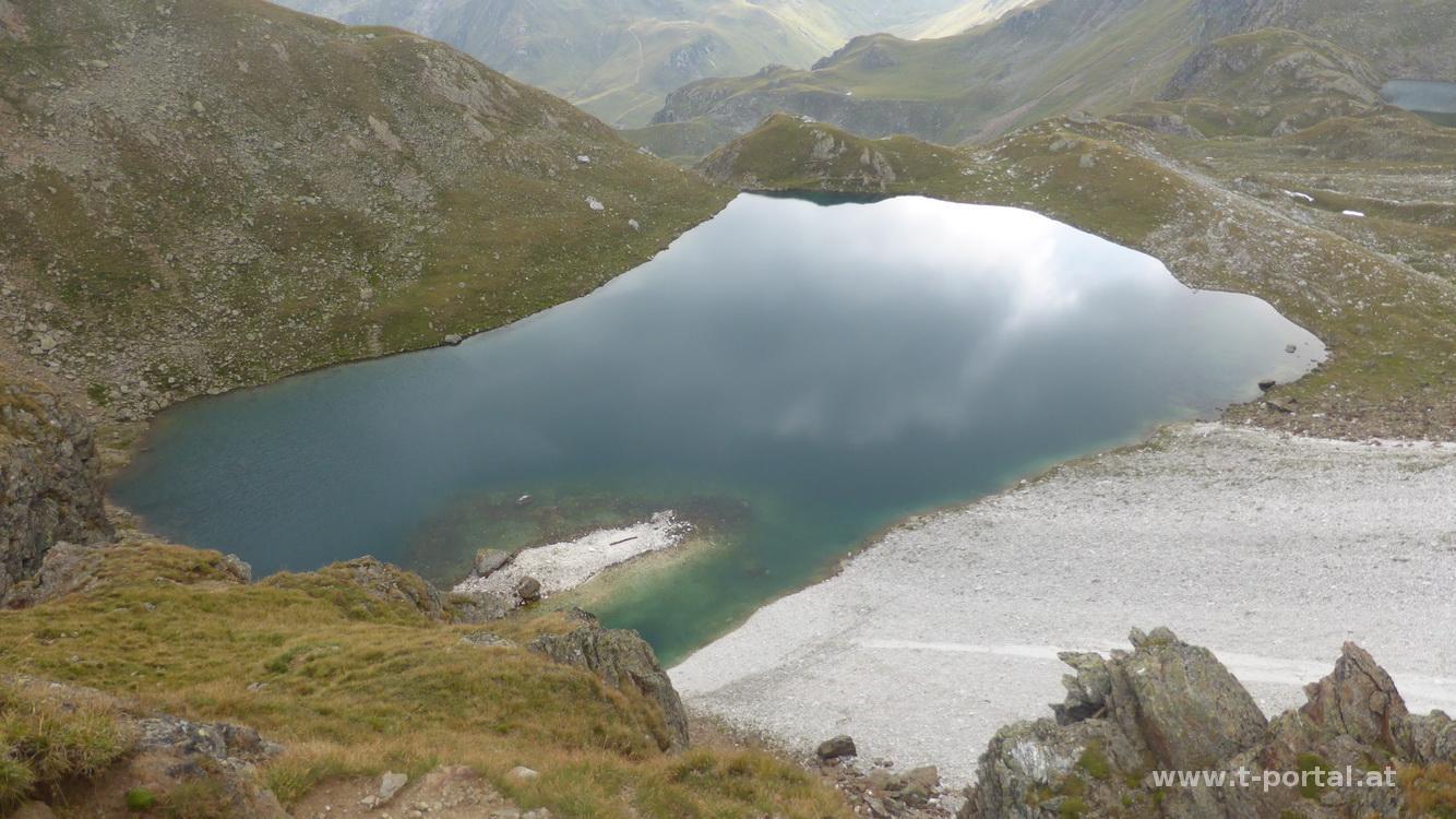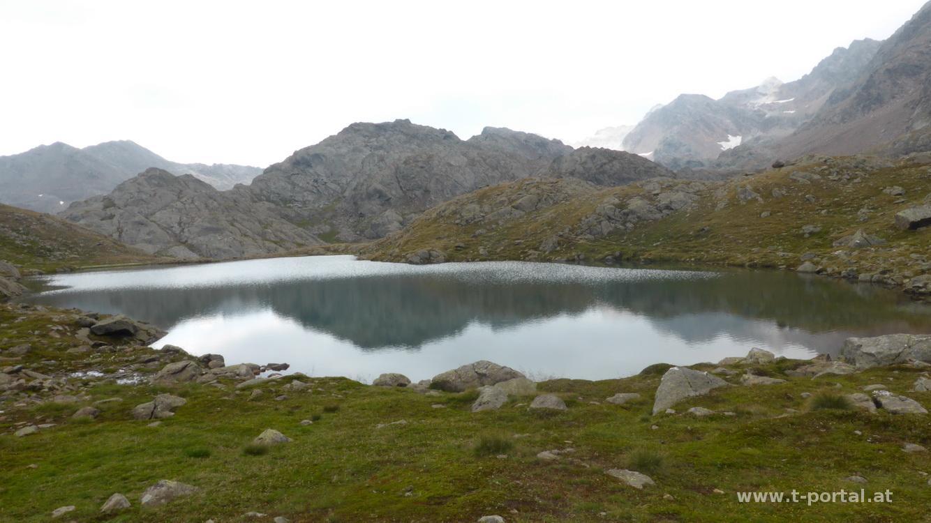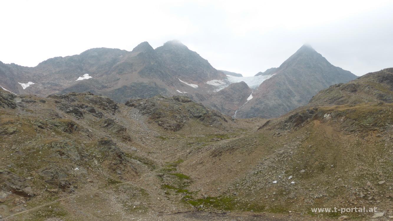 Auf der Terrasse blicke ich auf die wolkenverhangenen Gipfel und beeindruckende Gletscher der Umgebung. Bald geht es das Stück zurück und bergab bis zur Überquerung des reißenden Gebirgsbachs auf einer doch etwas wackeligen Brücke. Nun ein Stück eher flach dahin, vorbei an einigen Schafen, bis es über einige Steinblöcke wieder mehr bergauf geht. So erreiche ich den Trüben See, der im Gegensatz zum vorherigen Bergbach gar nicht trüb ist. Fasziniert blicke ich auf die weiten des Sees und des Gebirges um mich. Nach kurzer Pause geht es weiter rauf zur Seenplatte. Hier grasen Schafe und Ziegen und lassen sich von meiner Anwesenheit nicht sonderlich beeindrucken. Über die Seenplatte geht es etwas auf und ab, wobei ich teilweise von einem großen Felsblock zum nächsten steige, was das Vorankommen abwechslungsreich gestaltet. Nach der Überquerung eines weiteren Wasserlaufs komme ich zum mittleren Egentensee wo wieder Zeit für Pause und Fotoposen ist. Anschließend hinauf zum höchsten Punkt beim Egetjoch (2695m). Danach folgt der vorsichtige Abstieg zu zwei weiteren Seen. Vorbei geht es am Wegweiser zum Schneeberg (auf den führen wirkliche viele Routen :-) ) mit Ausblick zur Bergwerksstraße zum Poschstollen.
