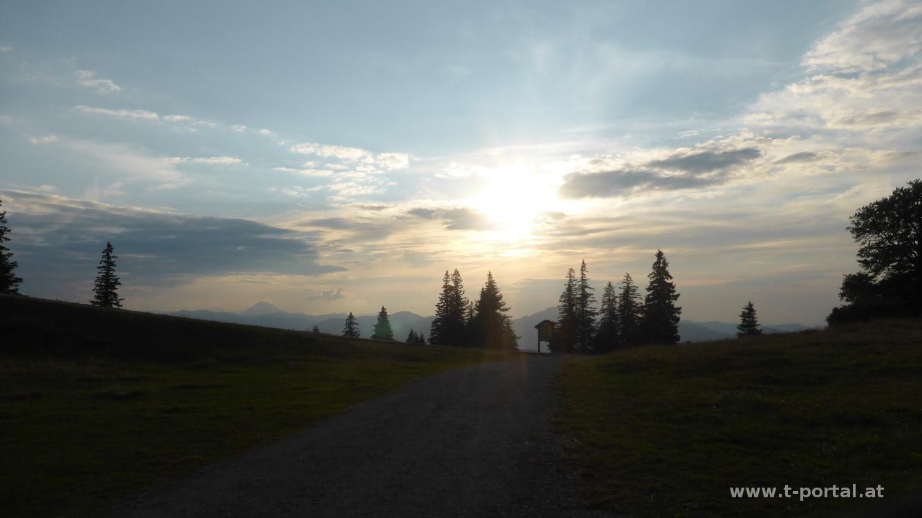 Die Hütte hat heute schon geschlossen, also verbrauche ich die letzten meiner eigenen Vorräte mit Ausblick auf Ötscher und Umgebung. Weiter geht es am Gratweg und auf der Asphaltstraße zur Muckenkogel, dem letzten Gipfel des Tages (Gipfel 7, kein Kreuz). Nun am Wanderpfad hinab zur Bergstation des Sessellifts und weiter zur Abzweigung zum Pichlersteig. Nochmal ist Konzentration gefragt, der Weg ist oft nass und rutschig. Nachdem ich auch diese Hürde gemeistert habe fehlt nur noch ein Stück durchs Gestrüpp zu den Wiesen über dem Pichlerhof. Vorbei an einigen Schafen geht es zur Forststraße, die mich die letzten dreieinhalb Kilometer zurück zum Ausgangspunkt führt. Bis ich dort ankomme, hat mein GPS Gerät schon Tag- auf Nachtmodus umgeschaltet, die Sonne ist also bereits untergegangen und es wird langsam dunkel.