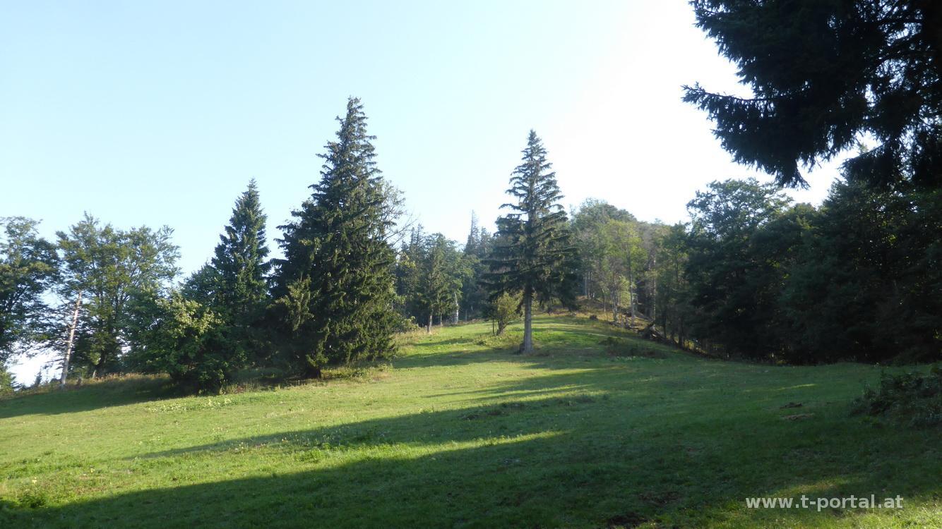 Diese Tour stand schon fürs Frühjahr auf dem Programm, irgendwie hat sich aber immer was Anderes ergeben. Nach dem wechselnden Wetter der letzten Tage und Schnee auf den höheren Gipfel hab ich den Tourenplan dafür wieder hervorgekramt. Die Runde ist die „korrigierte“ Version der Vorjahresversion, nachdem ich mir letzten Herbst Teile davon genauer angesehen habe. Start ist wie immer in Inner Wiesenbach bei der Kreuzung Engeltal/Schindeltal. Von dort geht es zurück zum Neutalerhof und entlang der Forststraße aufwärts. Dieses Mal geh ich gleich beim ersten Rechtsknick gerade aus auf Traktor und Steigspuren, bis ich wieder auf die Straße treffe, die bis zum verfallenen Quineck führt. Nun nach rechts, über ein Gatter und zurück zur dickeren Forststraße. Diese gequert und steiler durch eine steinige Gasse hoch. Am Ende dieser geht es nach links durch hohes Gras und nasse Wiesen auf der immer wieder Spuren zu erkennen sind. Es findet sich wieder eine Traktorspur, diese führt mich über eine Wiese bis am linkeren oberen Ende ein weiterer Pfad zu erkennen ist. So geht es weiter hinauf, bis ich auf eine dickere Straße treffe, an der sogar ein Jagdauto herumsteht. Es fehlt nicht mehr viel und die Gipfelwiese unter dem Wendlgupf ist erreicht. Zwischendurch habe ich heute schönen Ausblick zu den weiteren Ziel – Reisalpe, Muckenkogel und co. Die Wiese noch hoch und dann geht es durch Gestrüpp und über einige Steine bis zum Steckerlkreuz am Wendlgupf (Gipfel 1, Kreuz 1).