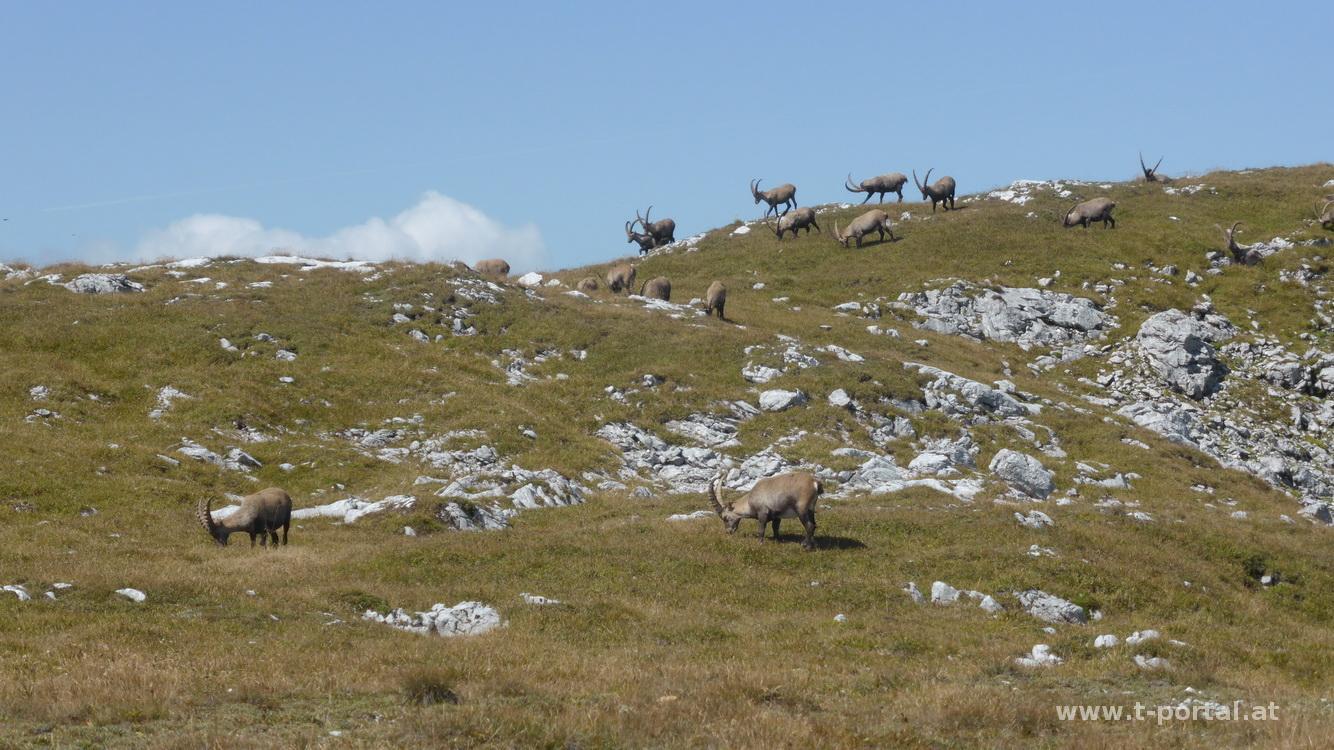 Anschließend geht es rechts vom Gipfelpfad zurück zum Fleischer Biwak und dann über die weite Hochfläche immer etwas auf und ab. Vorbei geht es am Zagelkogel, Hochwart; einer Gruppe Steinböcke und einigen Schneeflecken bis zum Abstieg in die Latschenzone. Hier ist nochmal Zeit um die Sonne zu genießen, bevor mich der weitere Weg bis hinab zur Häuslalm führt. Nachdem ich mich dort über spannende Diskussionen ("Warum habt ihr keine Murauer Weisse?") gewundert habe, wandere ich noch über Stein- und später Waldboden bis ins Tal. Das letzte Stück geht es an diesem tollen Tag auf der Forststraße zurück zum Ausgangspunkt.