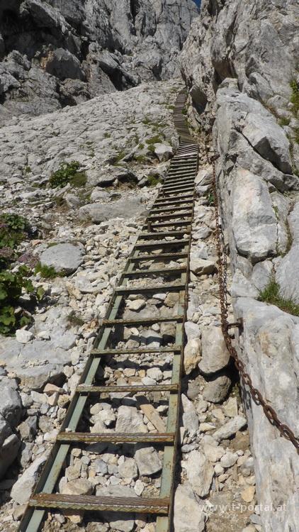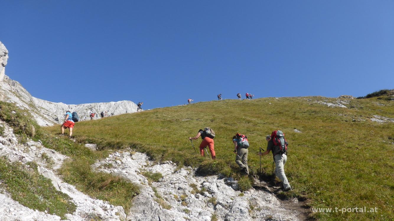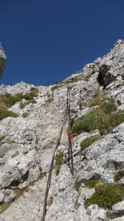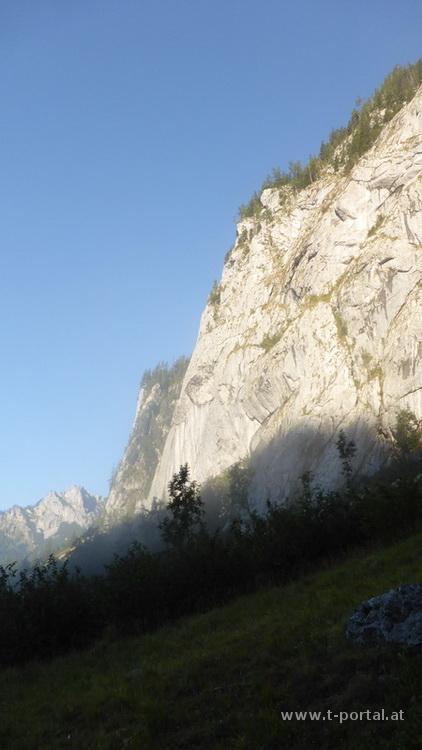 Für das heutige perfekte Wanderwetter hab ich mir die Tour übers G'hackte auf den Hochschwab ausgesucht. Bisher hat mich hauptsächlich die lange Anfahrtszeit abgeschreckt, heute lasse ich mich davon jedoch nicht abhalten. Am nebligen Parkplatz ist schon einiges los und auch ich mache mich gleich auf die Socken. Gleich zu Beginn wird auf einer Tafel von dem Auf- und Abstieg über G'hackte/Häuslalm/etc. an einem Tag gewarnt, für wenig Trainierte ist das wirklich nicht zu empfehlen. Der Weg führt zuerst auf einer breiten Forststraße gemütlich bergauf, bis es schmäler und auch etwas steiler wird. Bald durchschreite ich die Nebelgrenze und wandle auf Waldwegen weiter hinauf. So erreiche ich die Trawiesalm, nach der der Weg immer steiniger wird. Immer weiter geht es ins Tal hinein, bis dieses endet und nur noch der Anstieg in einigen Kehren zur Auswahl steht. Aus dem Schatten im Tal gelange ich in die Sonne und sehe viele Leute vor mir aufsteigen. So geht es weiter bis zum Einstieg beim G'hackten.